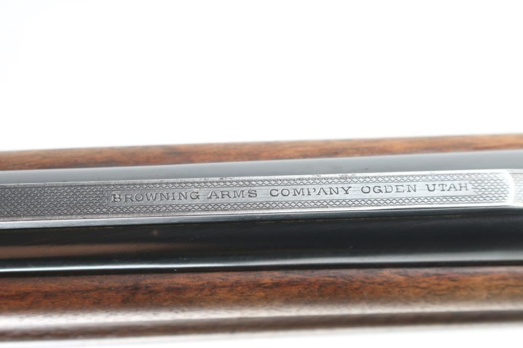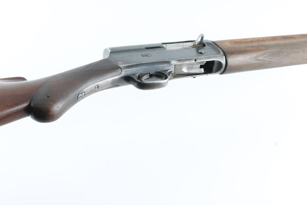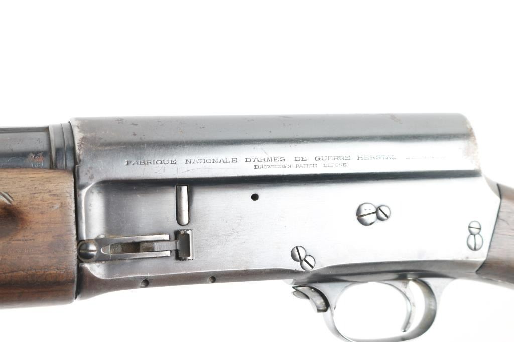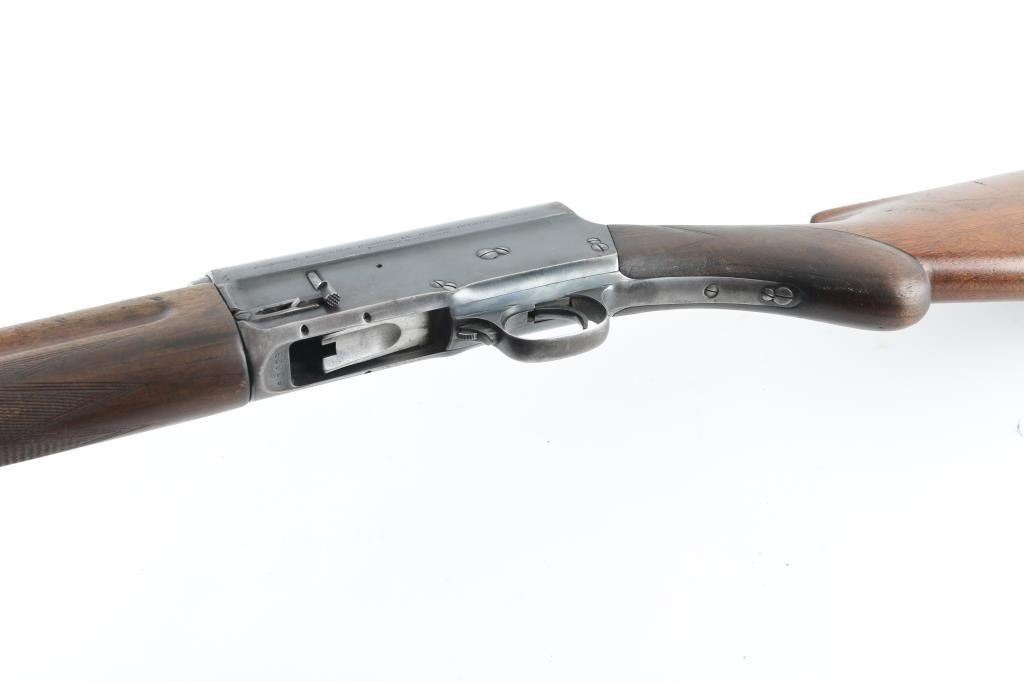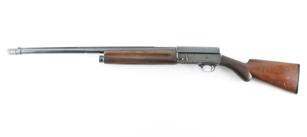Early pre- war Belgium made semi-automatic shotgun. Manufactured 1927. Sighting rib marked "Browning Arms Company Ogden Utah", FN markings on left receiver. Blued finish, 26" barrel w/ poly choke adjustable choke system, 1/2 length tube magazine, manual safety in the trigger guard , smooth trigger, magazine cut off, checkered walnut forend and pistol grip shoulder stock with Browning. Shotgun exhibits approximately 70% of it's original blued finish showing heavy wear and scattered scratches. There is some minor spots of pitting on the receiver. Action is smooth, bore is good/bright, needs cleaning, forend is very good and the shoulder stock is good with worn checkering on the wrist, some scratches/dings. NRA condition-Good. C&R Firearm.