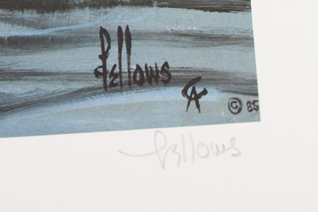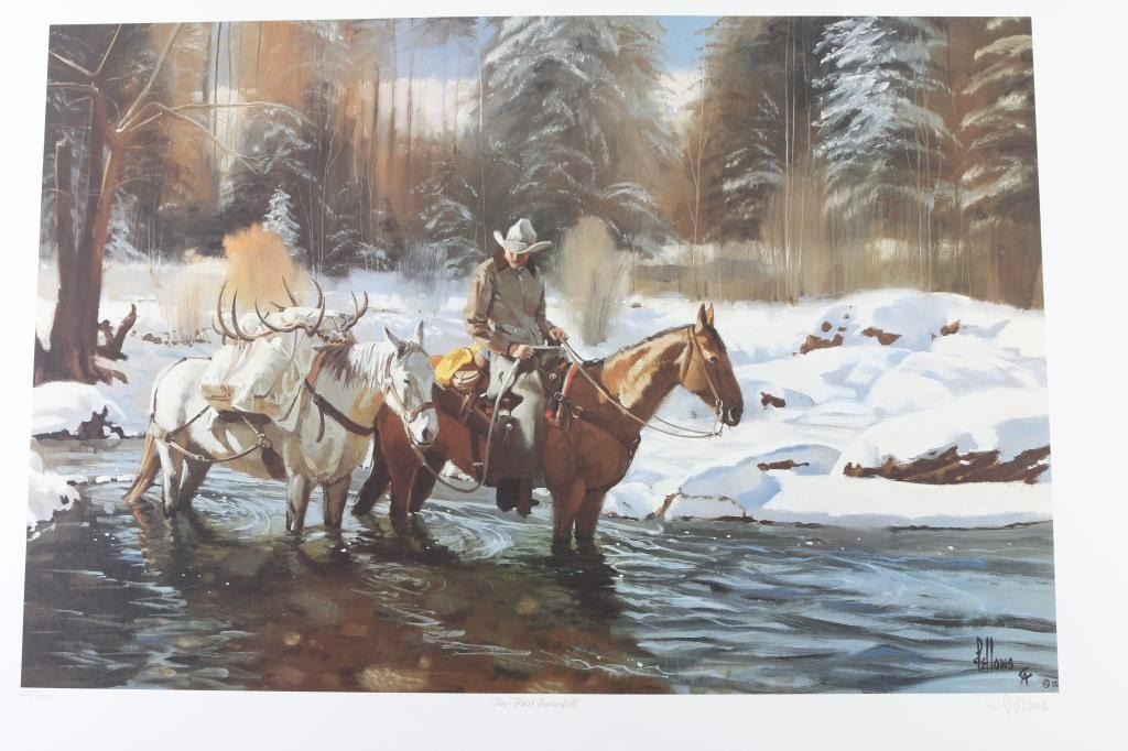By "Fred Fellows" entitled "First Snow Fall", hand signed lower right handed corner, limited edition, 625/1000. Unframed, measures 32x20", in good condition in sleeve.