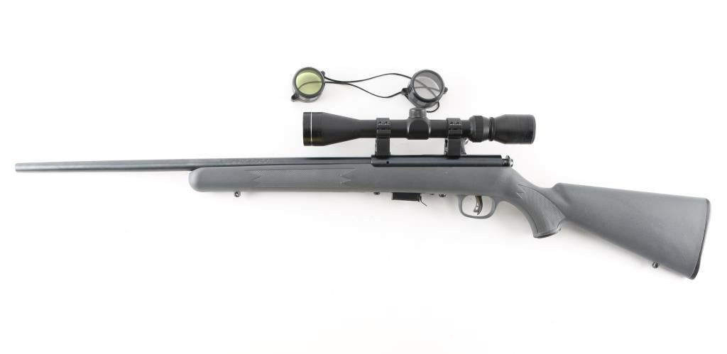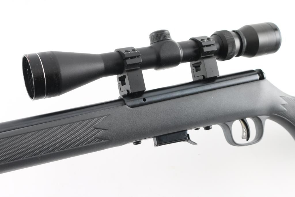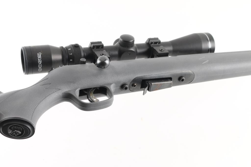 Canadian made Blued bolt action rimfire rifle in 17 HMR. Features 21 inch barrel, gray synthetic stock with checkering on the wrist, and forearm, factory buttplate, detachable magazine, studs for sling swivels, receiver mounted safety. Bore appears excellent/bright, a little dirty, Blue finish is about 99%. Stock is excellent. Action is smooth/tight, Almost new condition. Mounted with a 3-9x40 scope, no maker, clear optics. NRA condition-Excellent. Modern Firearm.