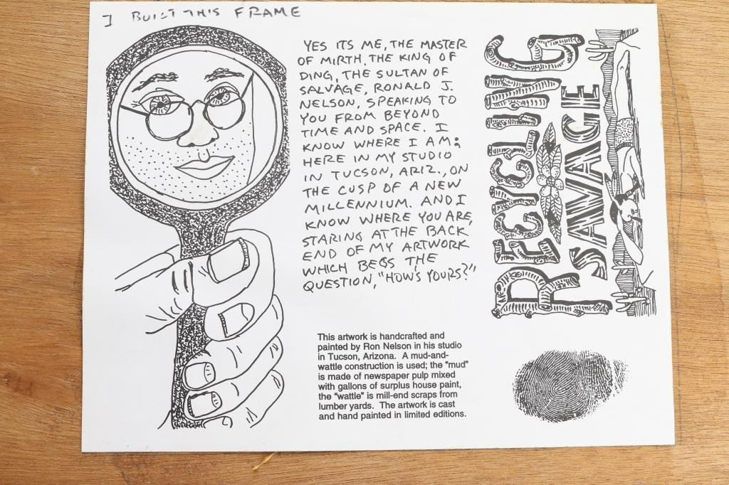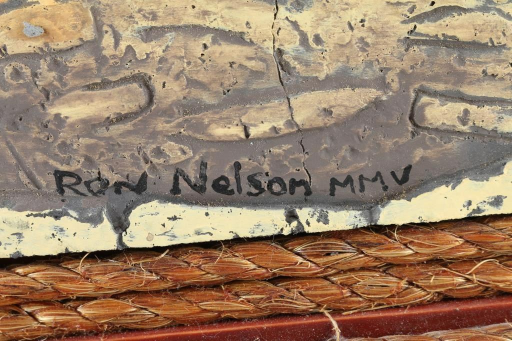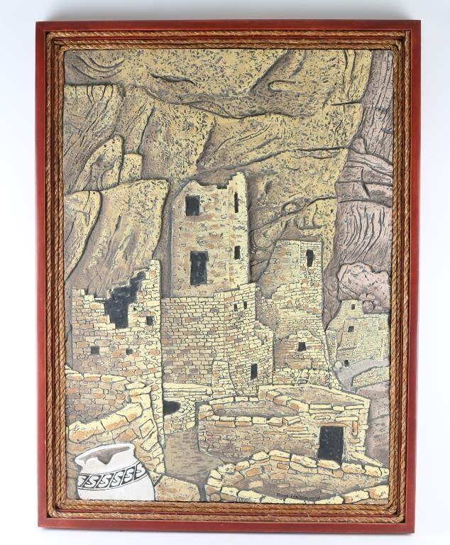 By Arizona artist Ronald J Nelson, hand signed lower right, depicting indian adobe, unique style of artwork, made by using mud and waddle, rope accented wood frame. Measuring 29x33"
