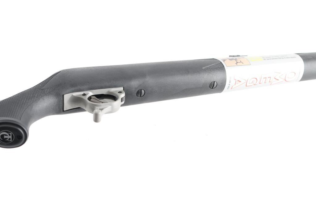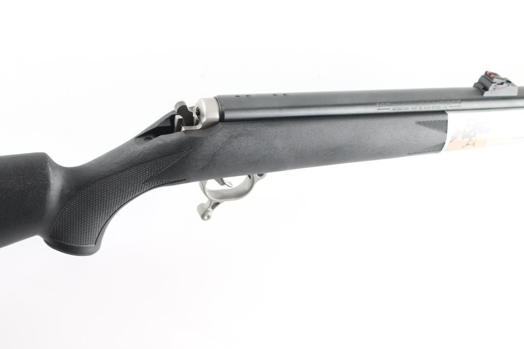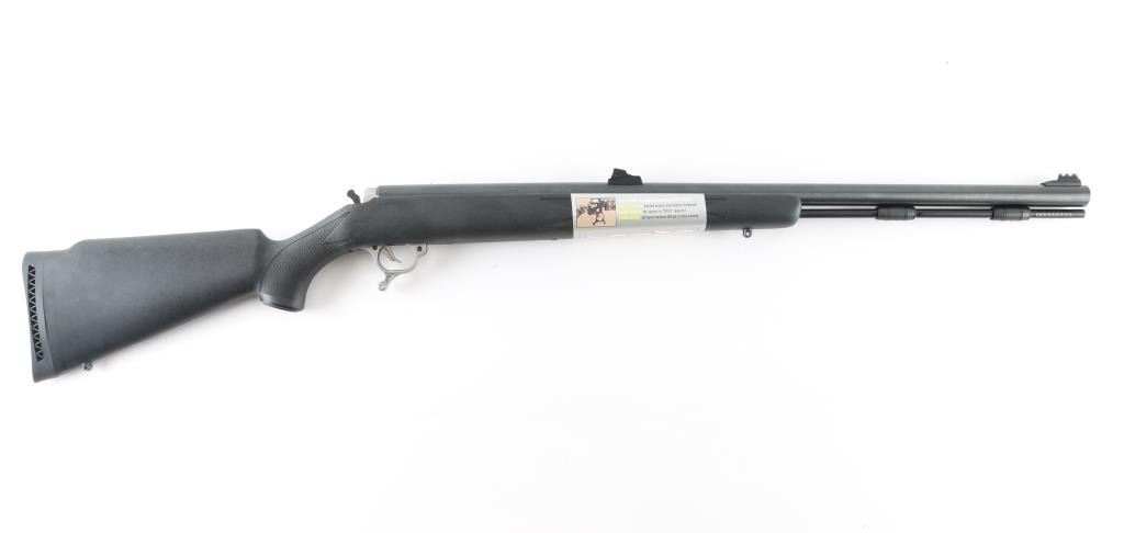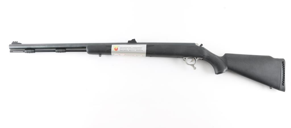 SN: Z12653 Muzzleloader Black powder rifle. the triggerguard lever pivots the breechblock downward, allowing easy access to the 209 primer pocket. 28" barrel with green fiber optic front, and red fiber optic u-notch rear sights. drilled/tapped for optics. Exposed hammer. Aluminum ramrod. Black polymer stock with checkering on the wrist, and forearm. vented rubber recoil pad. Rifle is like new condition, factory label still on stock. NRA condition-Excellent/Like new. Antique Firearm.