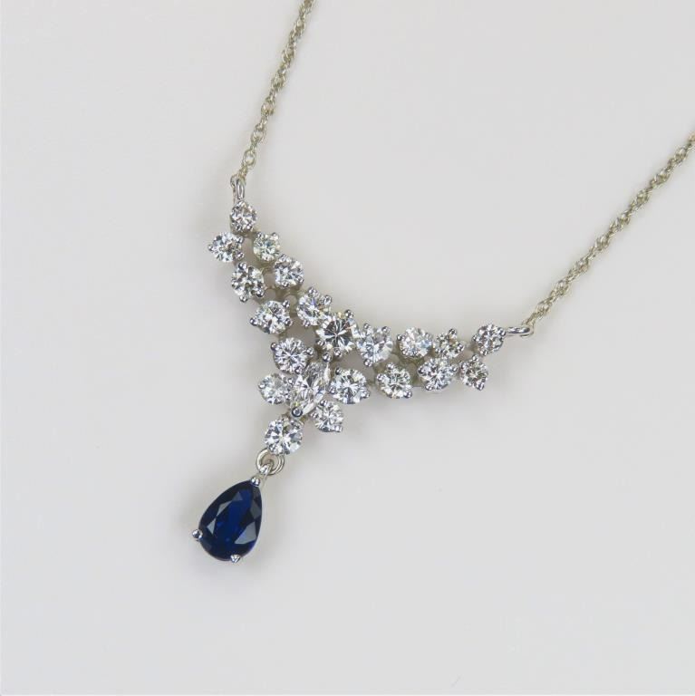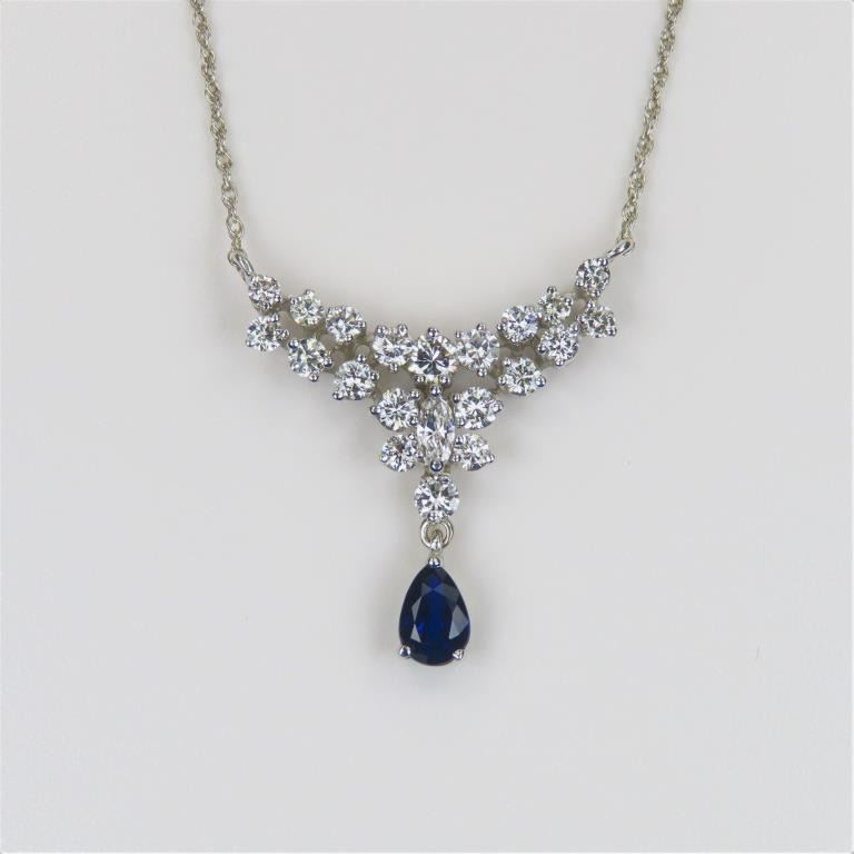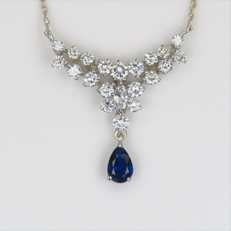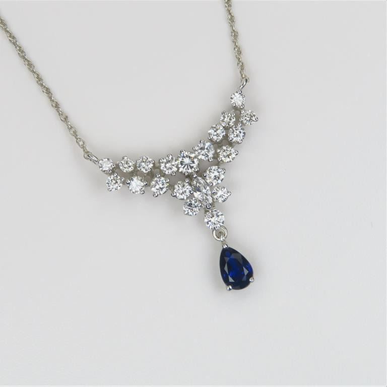 featuring a pear shaped Blue Sapphire weighing approx. 0.75 carats accented with 23 round and marquise cut Diamonds weighing approx. 1.50 carats with F-G colors and VS clarity set in an elegant 14 karat white gold necklace. Retail $4,000-$5,000