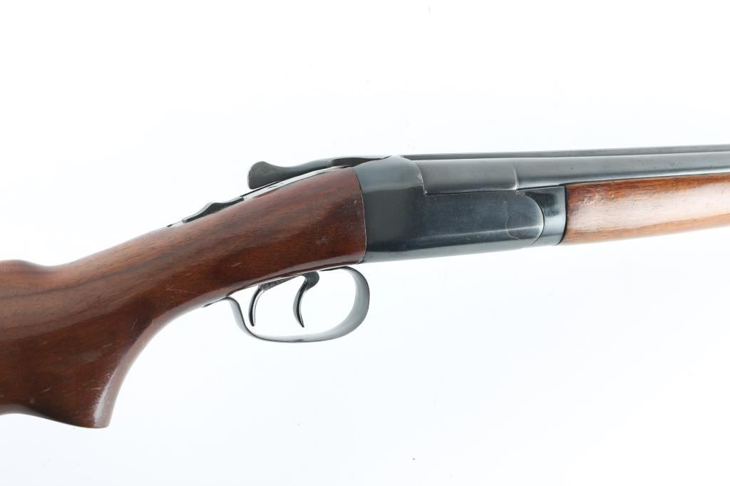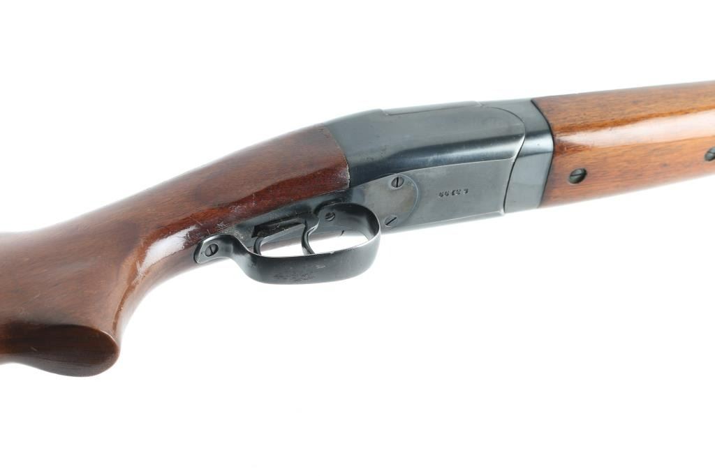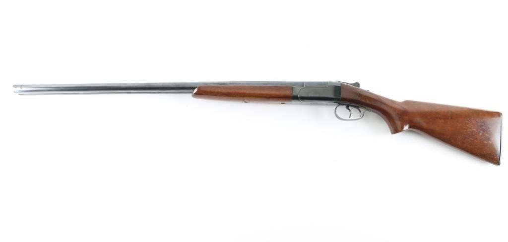 Double barrel Side x Side shotgun manufactured circa 1948. Features blued finish, smooth walnut forend & curved grip stock, 28" barrels, steel front bead, factory buttplate, double triggers, manual tang safety, extractors. Bores are very good condition, measure IM/CYL with a drop-in choke gauge. Retains 90% finish, possibly reblued, with light scattered patina in many places, edge losses. Wood is good condition, varnished. Buttplate fir to butt is fair, gap visible from sides. Approx 14.25" LOP to front trigger. Condition is NRA Good++ *** C&R Firearm ***
