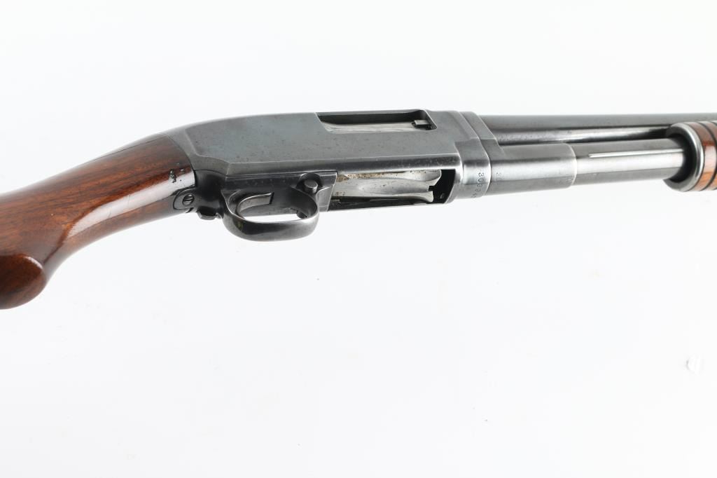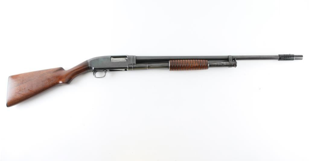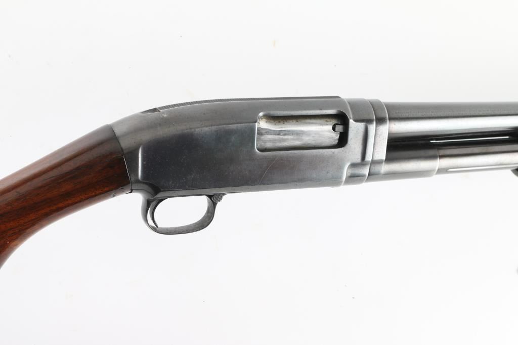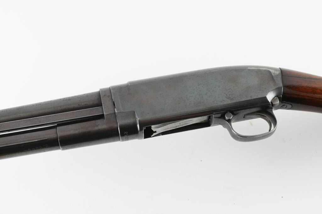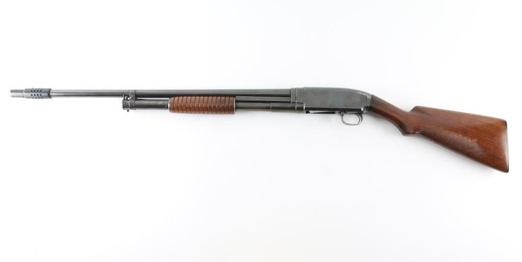 Vintage American made take down pump action shotgun manufactured circa 1923. Features 26" plain barrel, ported Weaver CYL choke attached to muzzle with front bead, re-blued finish, smooth wood semi-pistol grip stock & ribbed pump handle, factory plastic buttplate, push button safety. Bore appears excellent/bright. Retains 70% of the old re-blued finish with handling/friction wear, barrel markings are faint due to the re-blue. Wood is good condition with scratches, scrapes, there is some finish loss. discoloration on the buttstock. Numbers match on receiver & extension. NRA condition-Good as re-blued. C&R Firearm