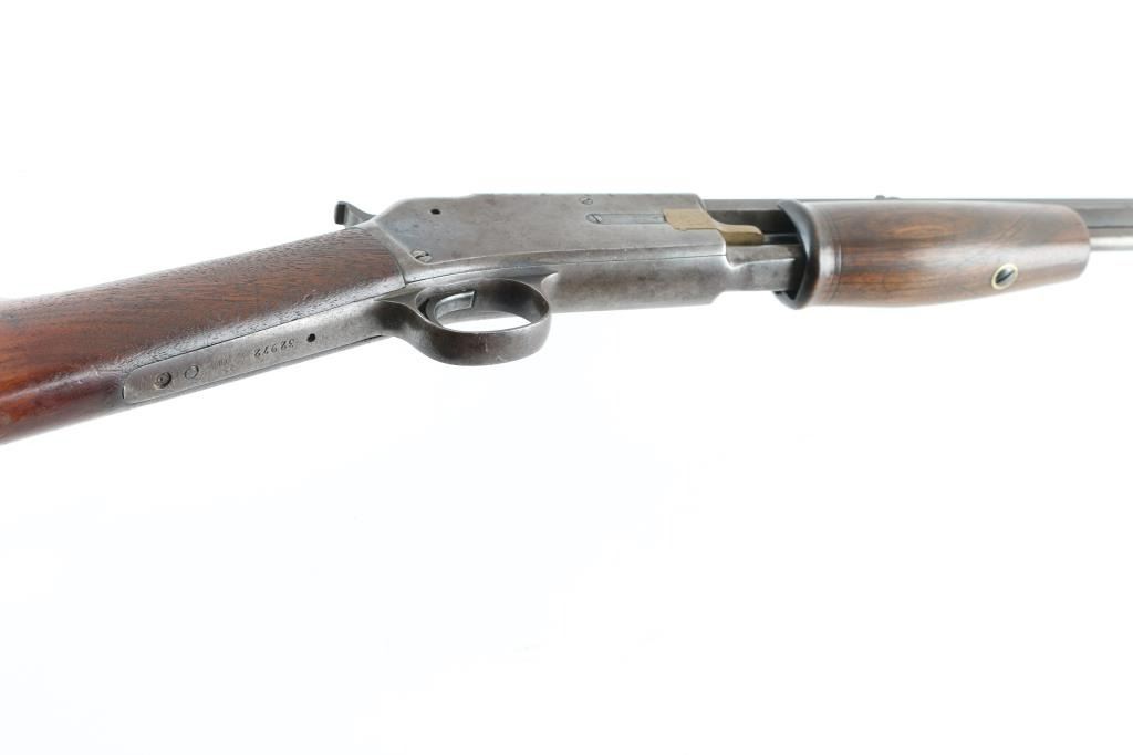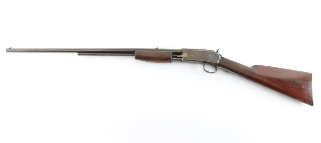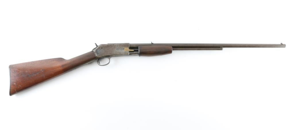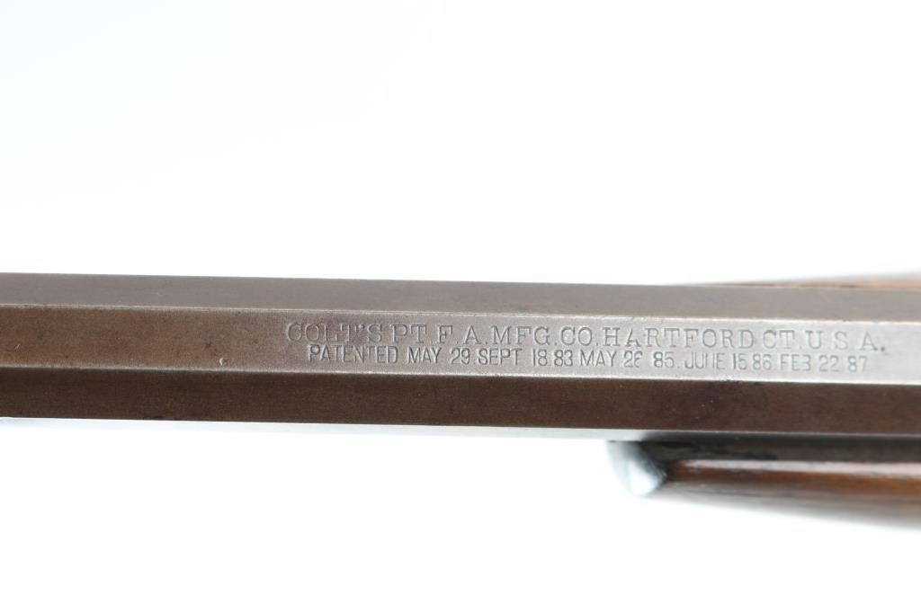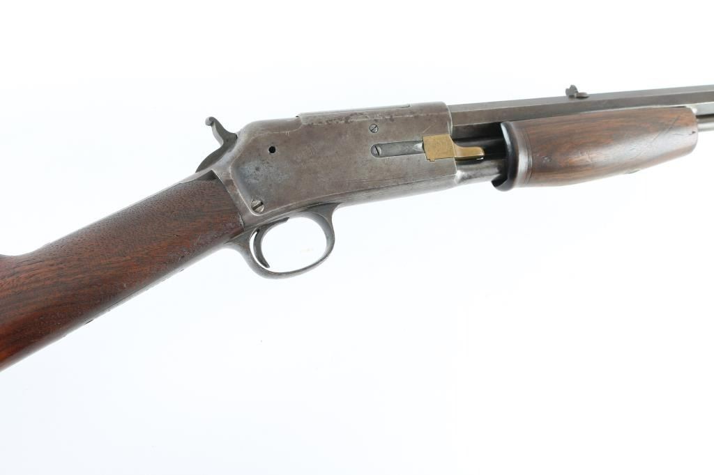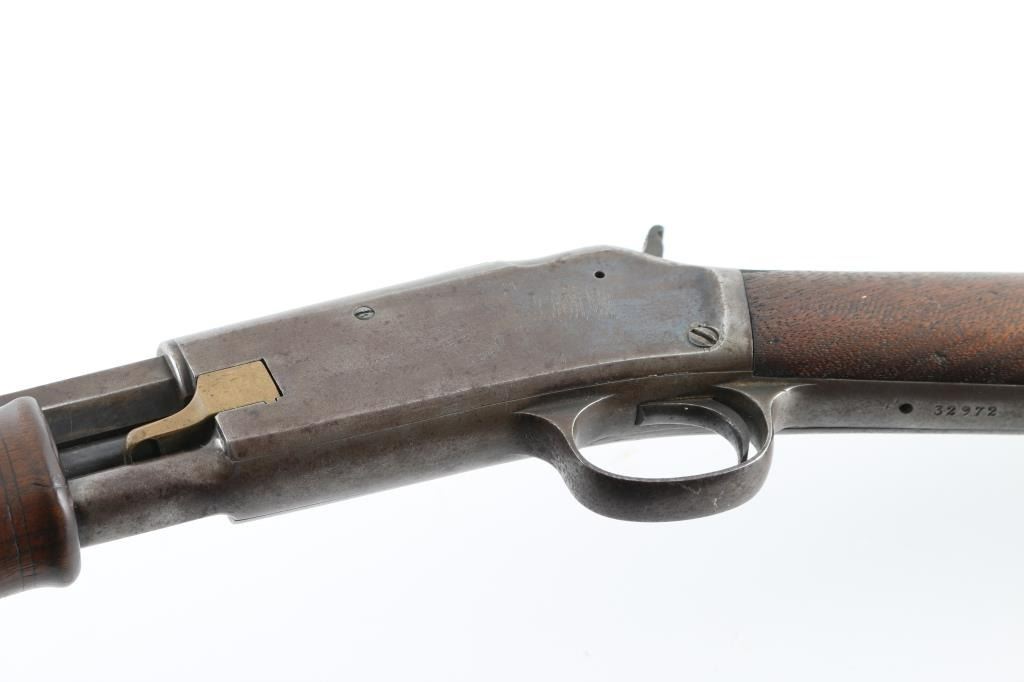 'Small Frame' Antique slide-action repeating rifle manufactured circa 1898. Features 24" tapered octagon barrel, dovetailed blade front sight, dovetailed rear sight with notch in single standing leaf, half-length tube magazine, smooth trigger, knurled hammer spur, smooth walnut slide handle and smooth straight grip shoulder stock with factory hard rubber buttplate. Bore is poor to fair condition, dark and corroded, visible continuous rifling. Metal surfaces show patina brown color, some dark original bluing in protected areas or in scallops, much bare metal on edges. Sides of receiver show patina, scratches, rough texture. Pump handle is very good condition. Stock is good condition, varnished, chips missing from corners at tang, rough texture at wrist, scrapes and dents throughout. Buttplate is good with smoothing of Colt Logo, small chip from heel. Two line address & patent marking on barrel is crisp. Condition is NRA Good+ *** Antique Firearm ***
