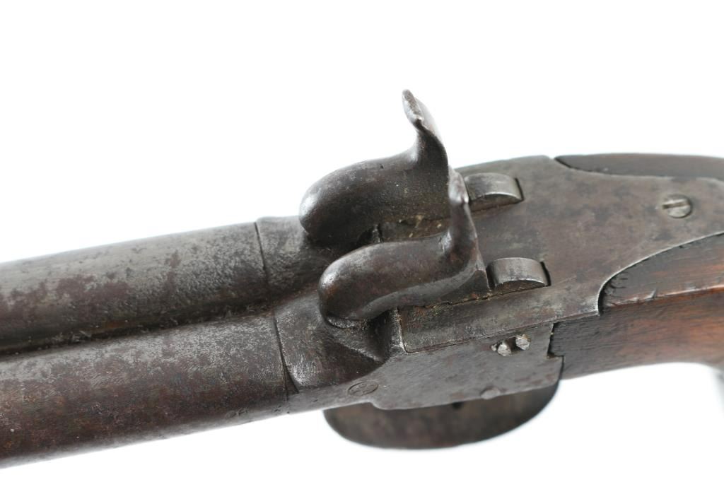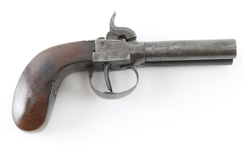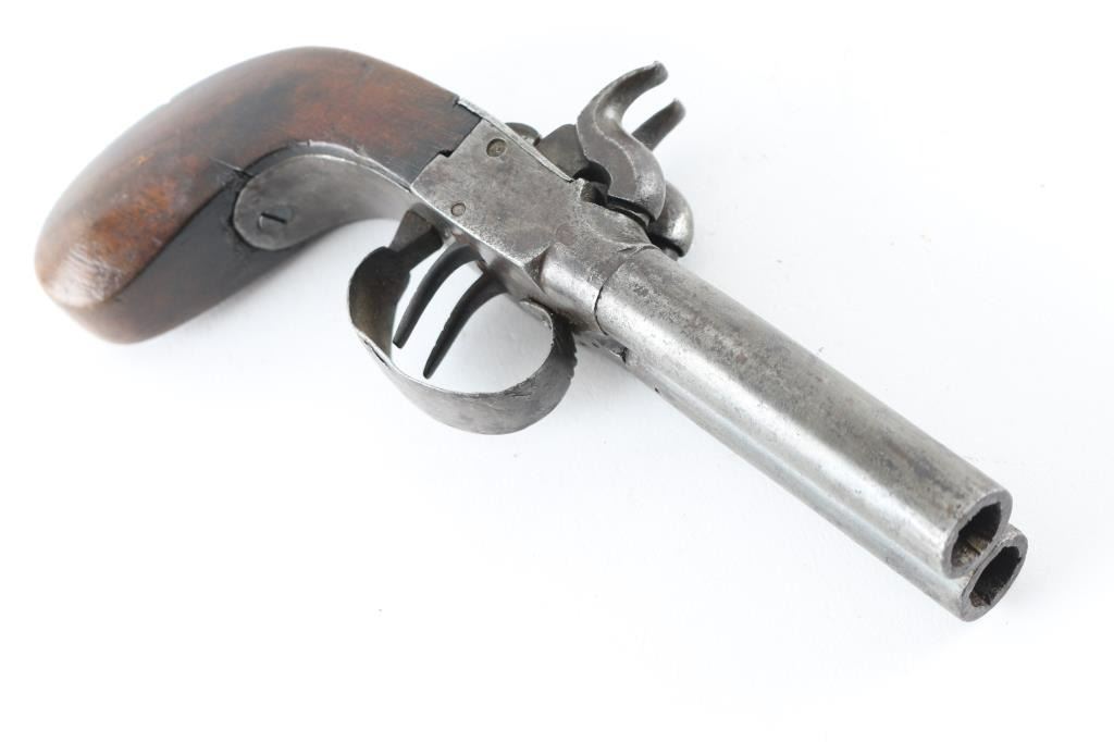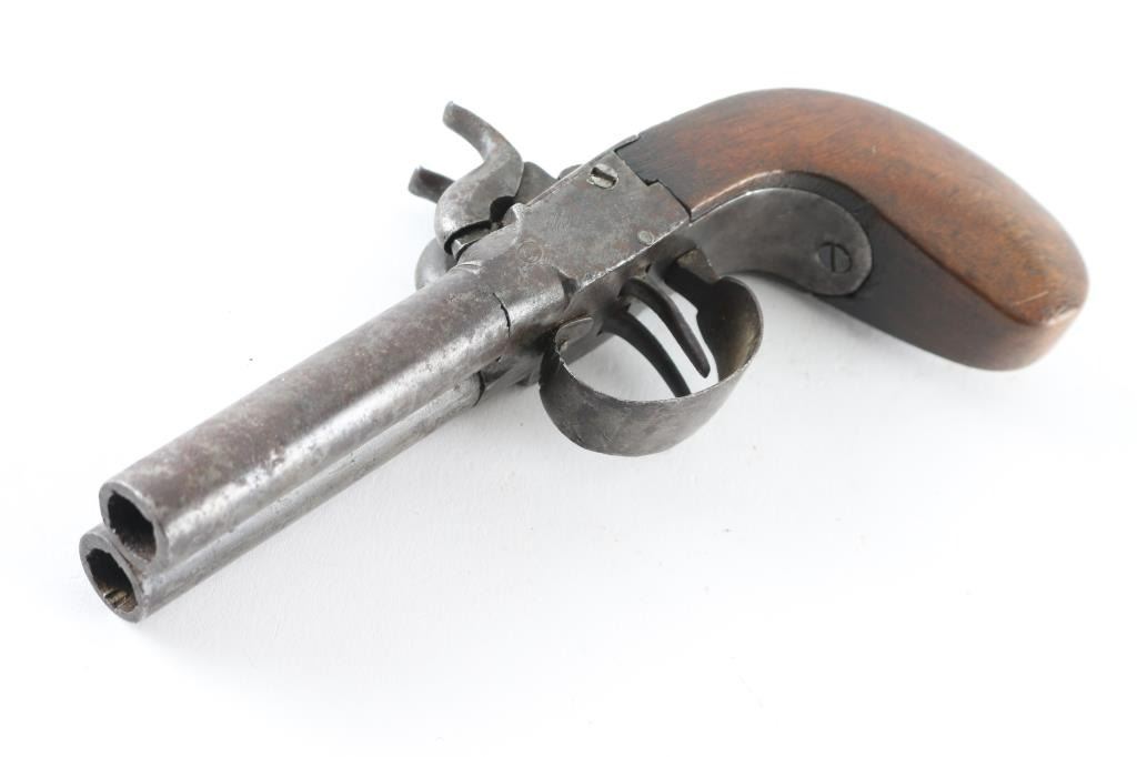 Belgium made double barrel percussion boot pistol. Liege proof on left frame. Approx. 41 Cal. 3" barrels. "Rabbit Ear" hammers, double triggers, wide triggerguard, and smooth wood one piece bag grip. Metal has turned a dark gray patina with scattered pitting/rust. Smooth bores are dark, grip is very good. Action is crisp/tight, and barrels lock up tight. NRA Condition-Good as Antique Firearm.