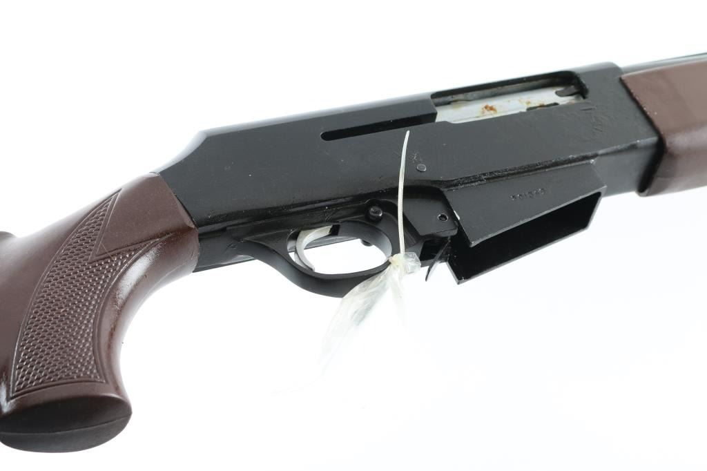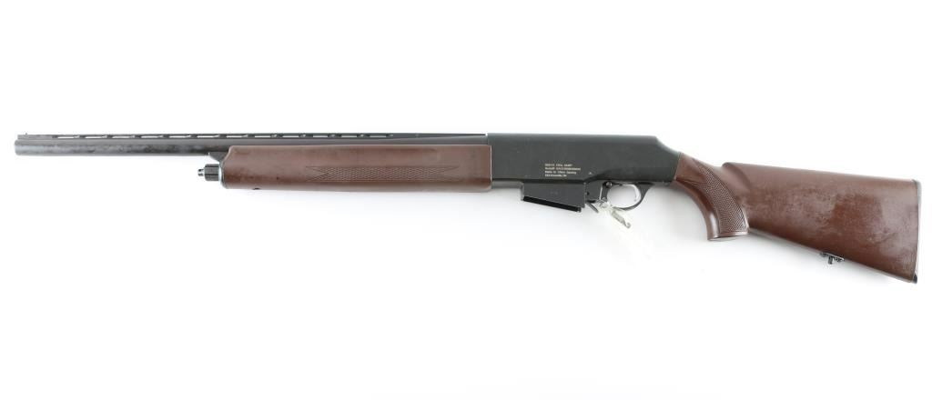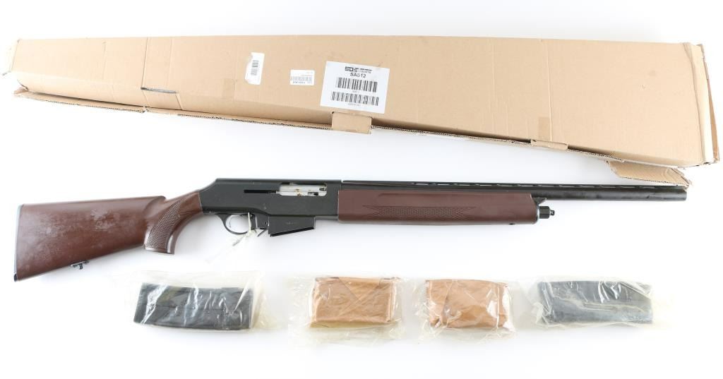 Chinese made semiautomatic shotgun, imported by DDI of Knoxville TN. Fed by detachable box magazines, accepts 2-3/4" shells. Features blued finish, reddish brown polymer furniture, 23.5" vent rib barrel, fixed choke measures "IM", bead front sight, manual safety. Shotgun is still packed in grease, in sealed bag, appears new condition, the charging handle is still uninstalled (in plastic wrap tied to triggerguard). Includes two 3-rd magazines, two 5-rd mags, manual, factory box. Condition is NRA Excellent - like new *** Modern Firearm ***