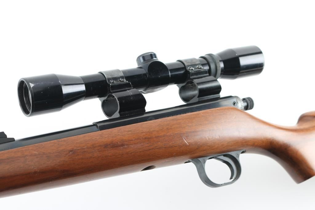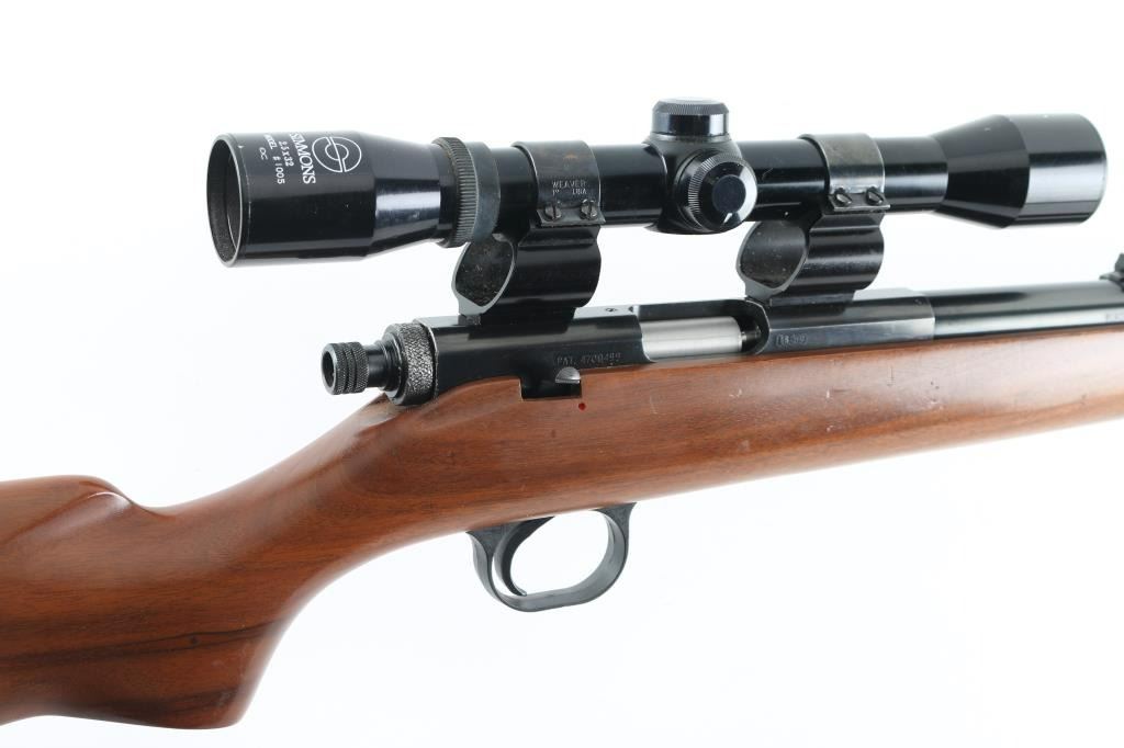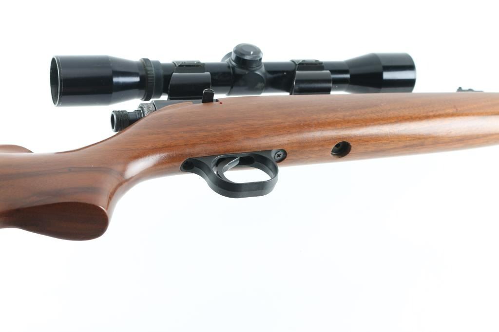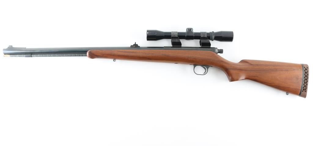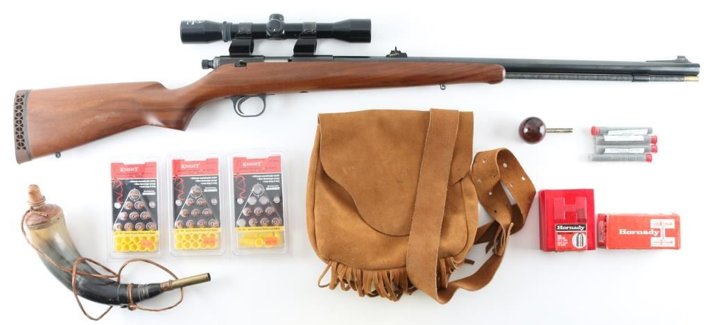 Inline percussion lock muzzleloader for use with Black Powder (or Pyrodex or other substitute) ONLY. Features blued finish, smooth walnut stock with curved wrist, 25" barrel, synthetic ram rod under barrel, Williams sights (blade front, adjustable rear), manual safety, sling studs, ventilated rubber recoil pad, see thru scope mounts screwed to receiver, mounting a Simmons 2.5x32mm scope. Bore is very good bright condition. Retains 85% blue with scratches, handling marks. Knurled ring to disassemble action shows tool marks. Wood is very good with some small dents and other blemishes. Scope is very good with clear view, duplex reticle. Currently set up for what appears to be a #11 cap for ignition, includes another breech plug and bolt for 209 primers. Includes original cardboard box, suede "Possibles" bag, cleaning and maintenance tools, accessories, speed loaders, vintage styled (recent manufacture) powder horn, bullets, patches, other items. Condition is NRA Very Good *** Antique Firearm ***