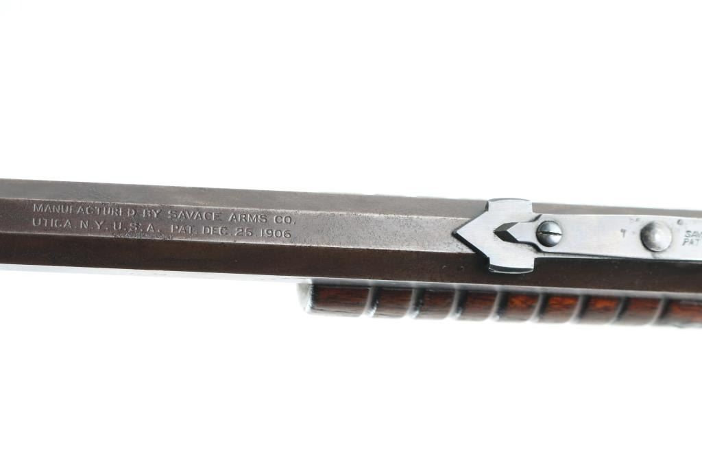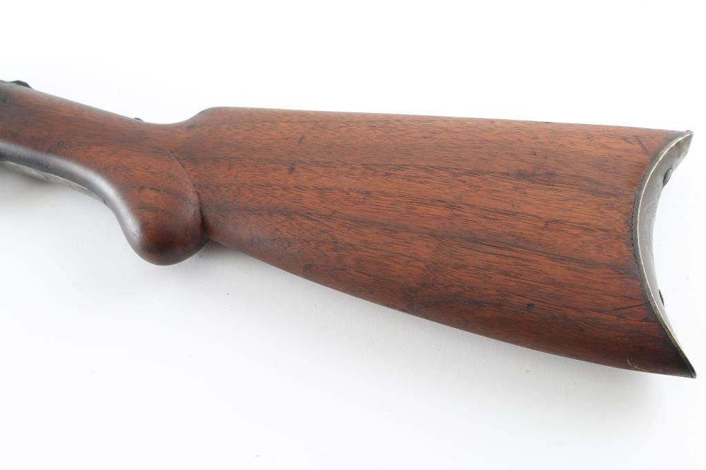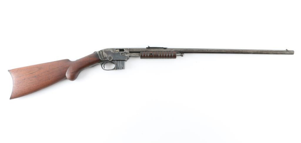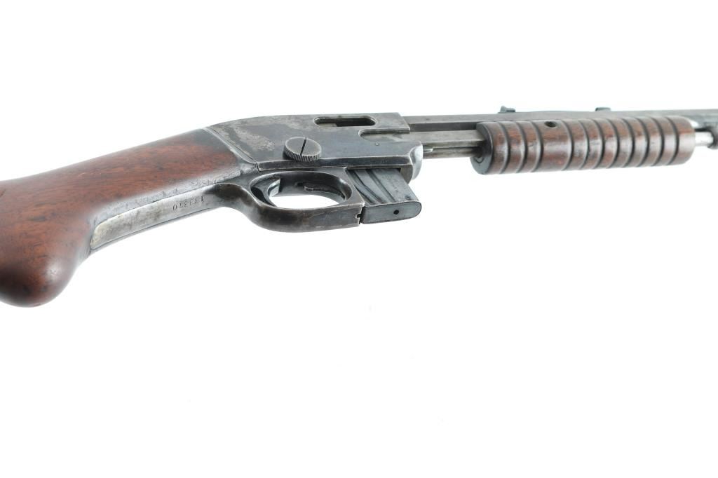 Slide action magazine-fed repeating rifle chambered in .22 caliber, circa 1903-1906. Features a fully blued finish 24" octagonal barrel, blade front sight, adjustable "Savage" rear sight, take-down receiver, smooth trigger, safety switch on tang, 10 rd savage marked magazine, grooved pump handle, plain rounded pistol grip walnut stock and metal crescent buttplate. Finish is moving to a brown patina with high edge wear and dark scattered surface rust. Traces of blue. Markings are good, action is smooth, bore is dark/rough with light rifling and wood is very good. NRA Condition-Fair to Good. C&R firearm
