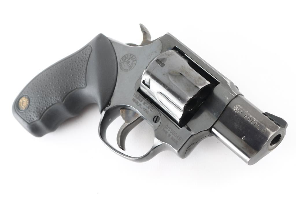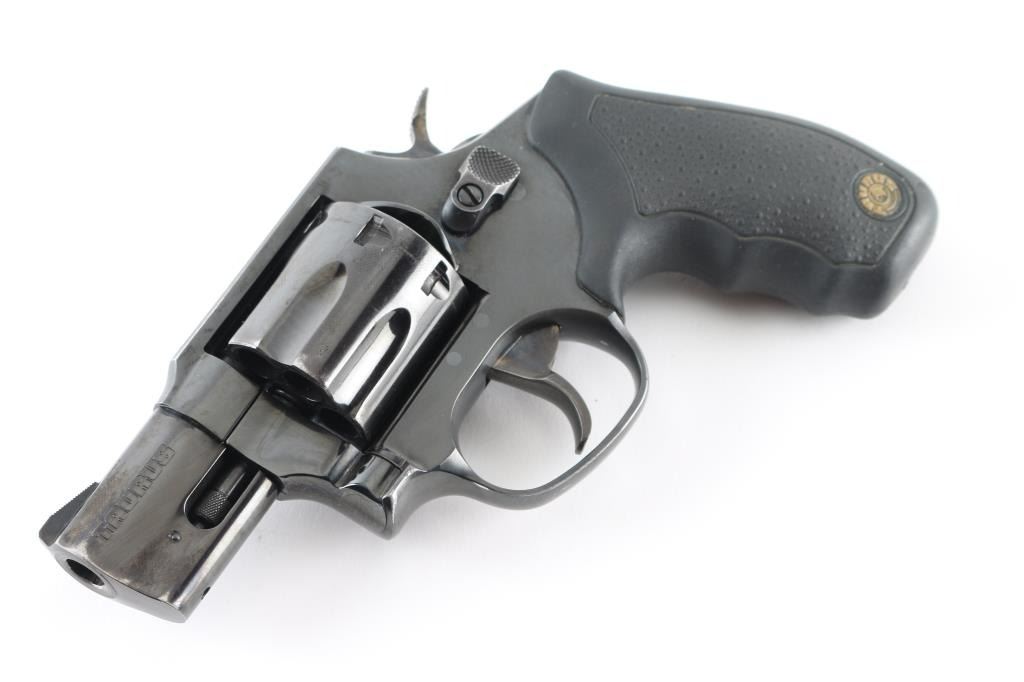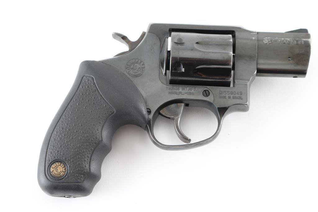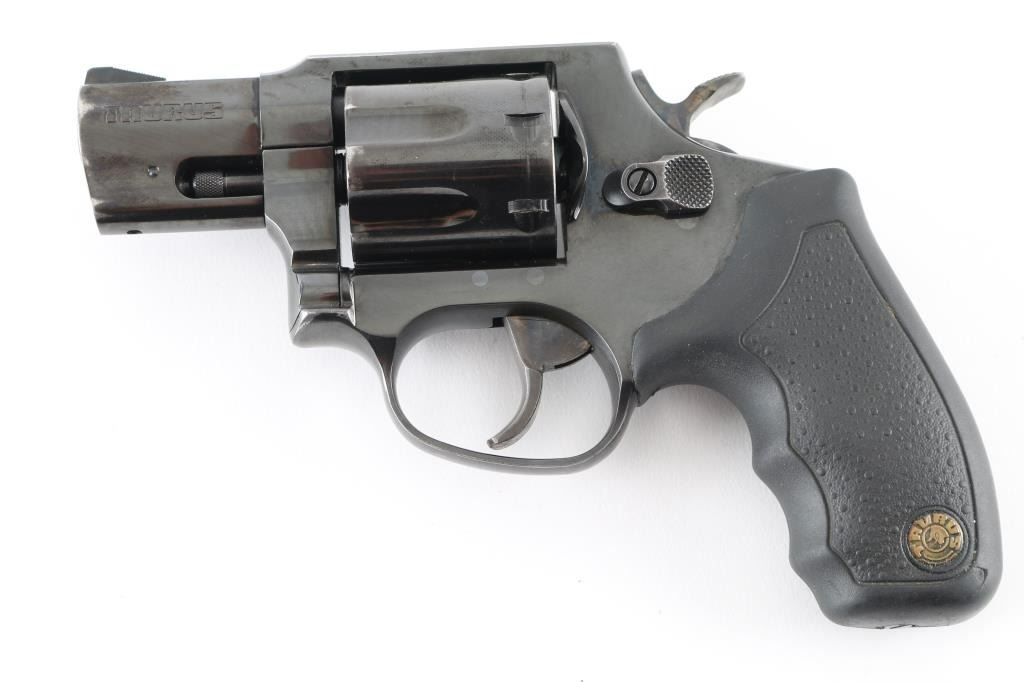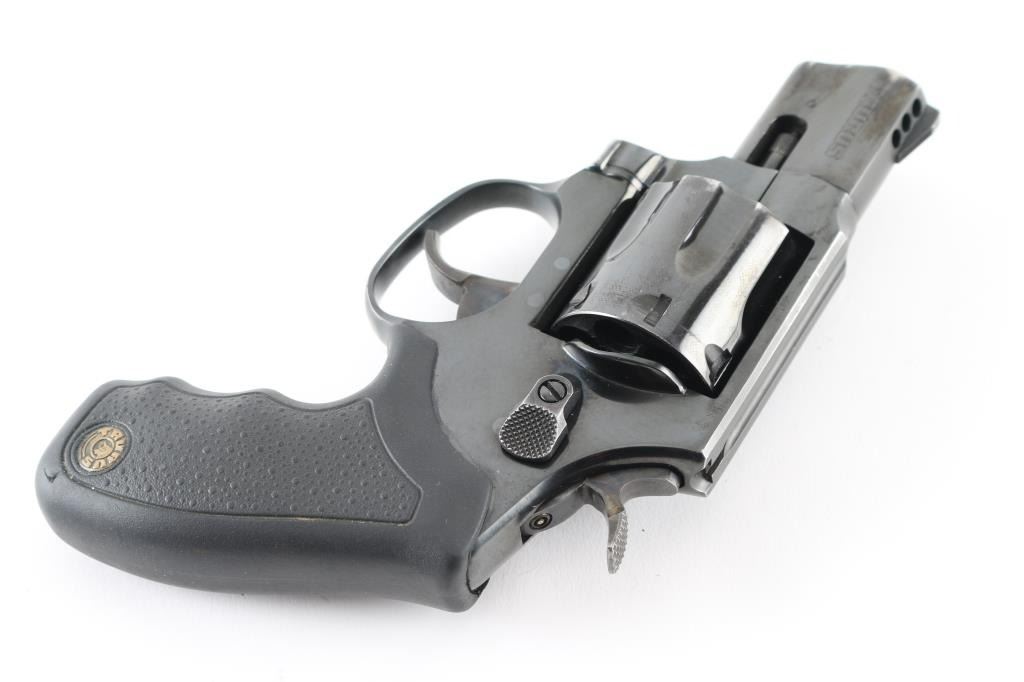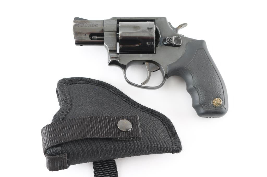 Made in Brazil this is a snub-nose, 7 shot revolver with a fluted cylinder, chambered for .357 Magnum cartridges. It features a blued stainless steel frame, 2" ported barrel, serrated ramp front sight, integral rear sight, wide smooth trigger, knurled hammer spur and finger groove textured rubber grips with Taurus medallions. Trigger and hammer are color case hardened and show color. Metal finish shows some wear with some loss of blue at the muzzle and front of cylinder and also a drag line on the cylinder. Grips are fine. Bore looks good, bright. Comes with an Uncle Mike's size 0 holster. Condition is NRA Good modern firearm