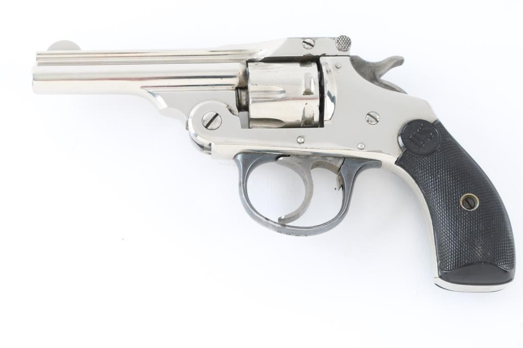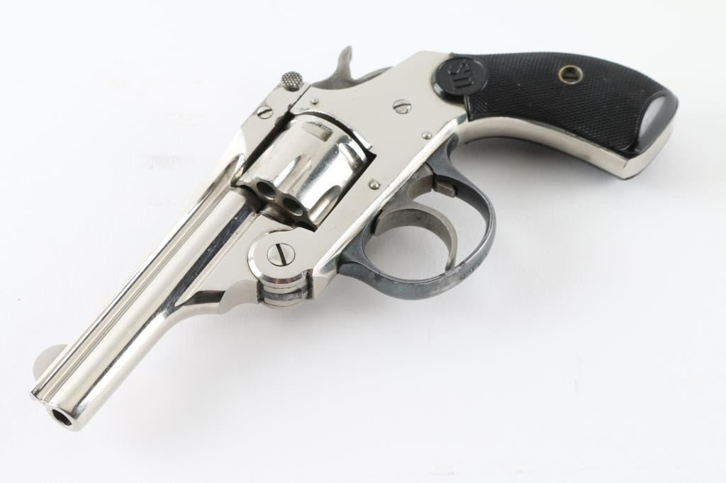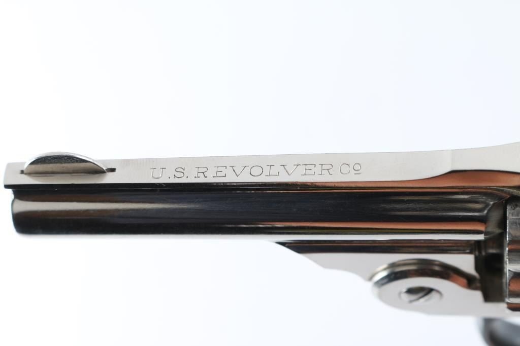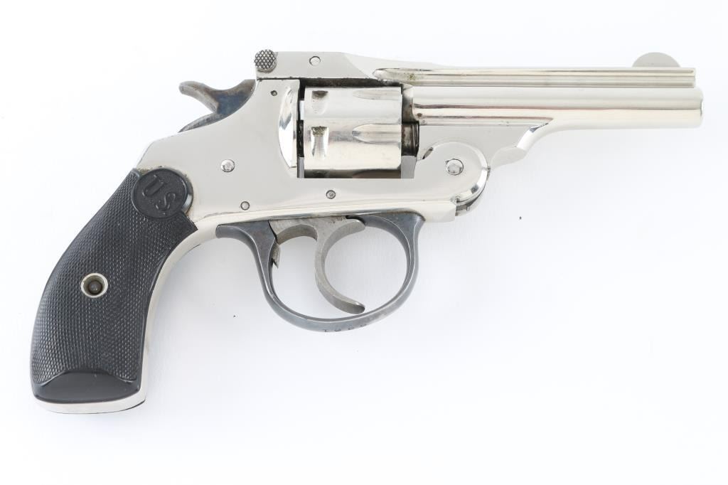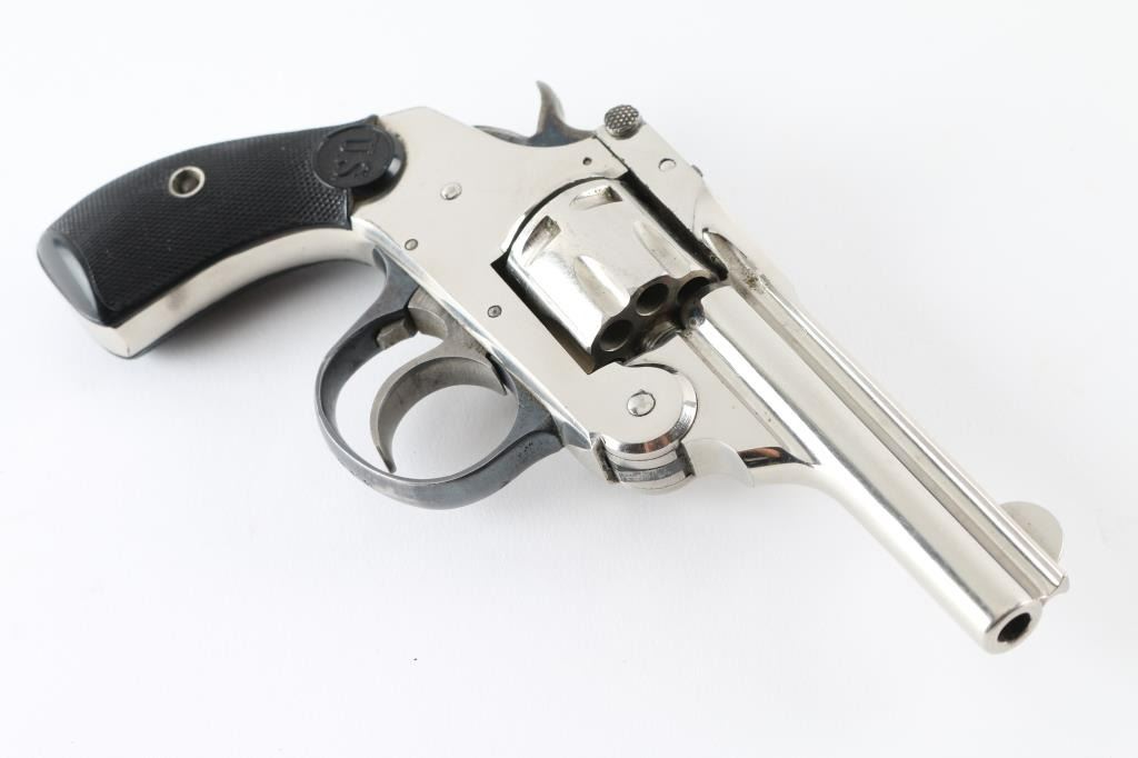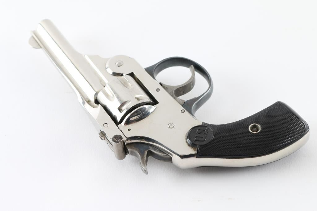 Vintage break top double action revolver, chambered for older vintage 22 caliber rimfire ammunition. Features nickel finish, blued trigger guard, case hardened trigger & hammer, checkered black hard rubber or plastic grips with "US" logo, 3" barrel, 7 shot fluted cylinder, fixed sights. Bore is fair condition, eroded and frosted with visible rifling. Finish is very good, bright with little visible puckering, no flaking. Grips are very good. Action is smooth with good lock-up. Firing pin does not retract or rebound, needs to be corrected. Condition is NRA Fair (mechanical issues) *** C&R Firearm ***