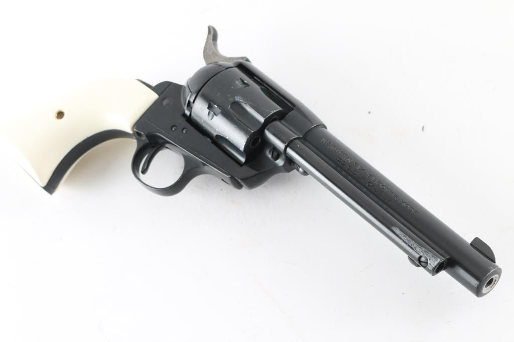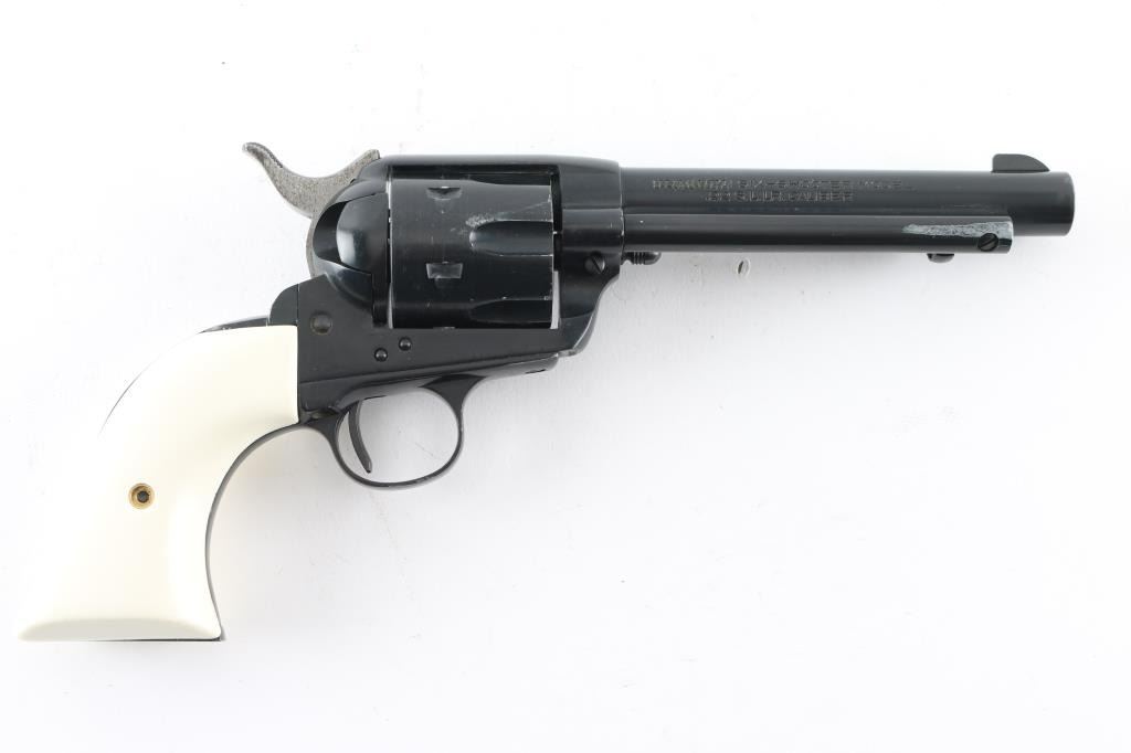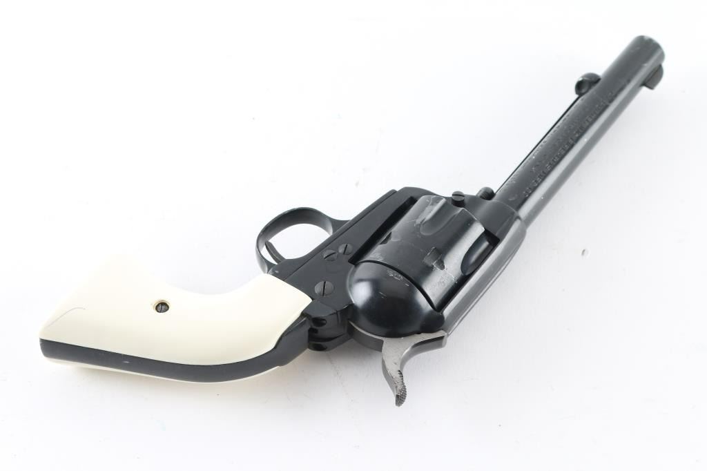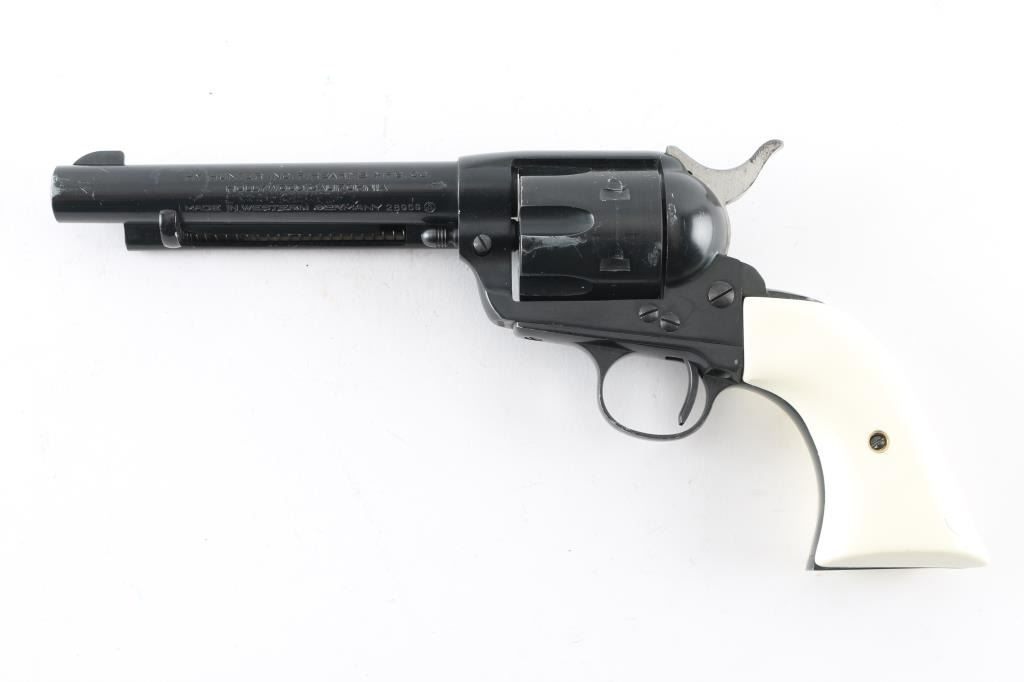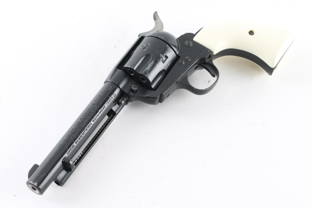 Western Style single action rimfire revolver made in West German, imported by Hy Hunter in Hollywood CA. Appears to have much Zamak or similar metal in its construction, and to be a bit larger than other rimfire SAA clones, closer to the size of the centerfire models. Features 6 shot fluted cylinder, 5.5" barrel with fixed sights, black finish, white polymer faux ivory grips. Barrel and charge holes are steel lined, very good condition. External condition is good, with 80% coverage, much bare metal showing in scratches and scrapes, edge losses. Grips are very good. Right side of barrel has a word that is obscured by punch marks to obliterate the word before "SIX-SHOOTER MODEL", appears done at factory before finish was applied (probably "Frontier" as this full name belonged to Colt). Action is smooth with good lock-up. Condition is NRA Good++ *** Modern Firearm ***