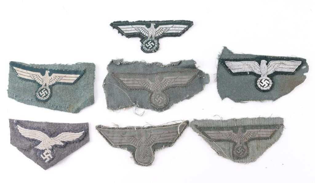 Seven total. All cut from tunics. All have parts of the tunic except one. It was common for GIs to cut these off the tunics of POW/KIAs for souvenirs. Includes 5 Army bevo eagles, 1 Luftwaffe eagle off of field gray tunic, and a wire eagle off an officers tunic. (Tunic appears to be blood stained). Consigner states these all came from the estate of the same veteran in NY.