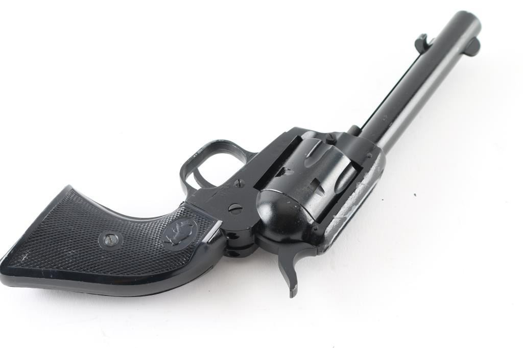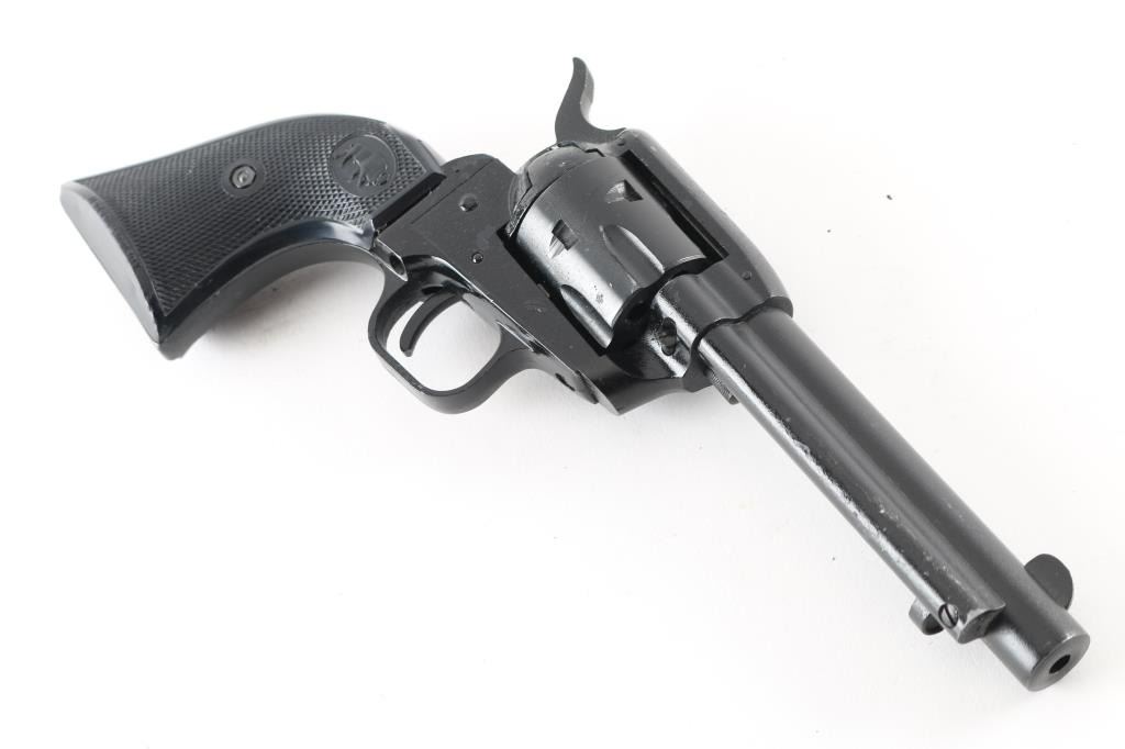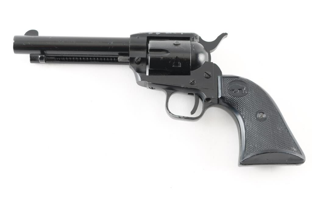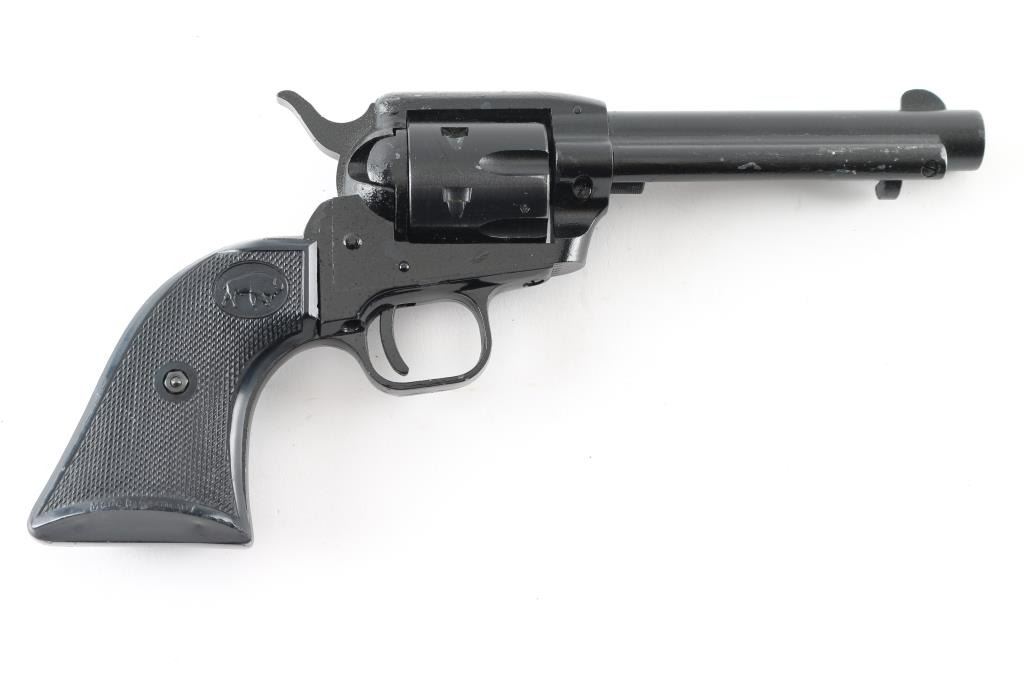 Made in Germany this is an inexpensive 6 shot, single action revolver chambered for .22 LR only. It has a 4.75" barrel, fixed blade front sight with machined in the frame rear notch sights, serrated hammer spur and two piece checkered plastic grips with a buffalo logo. At some point someone painted this gun with black paint and it is flaking off in spots leaving bare metal. The bore looks good. Condition is NRA Good *Modern Firearm*