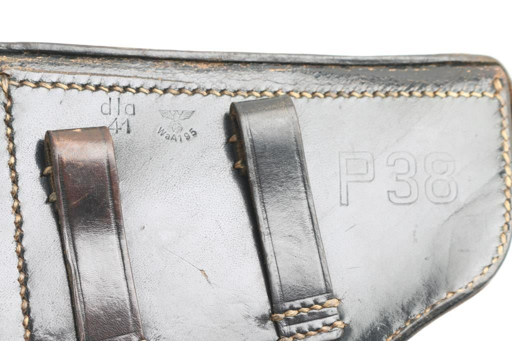 Third Reich era German Military holster for the P-38 Pistol. Hard shell. Black leather construction. Large "P.38" stamped on back, along makers code dla, dated 1941, and Waffenamt, Eagle/WaW195. Intact, very good condition.