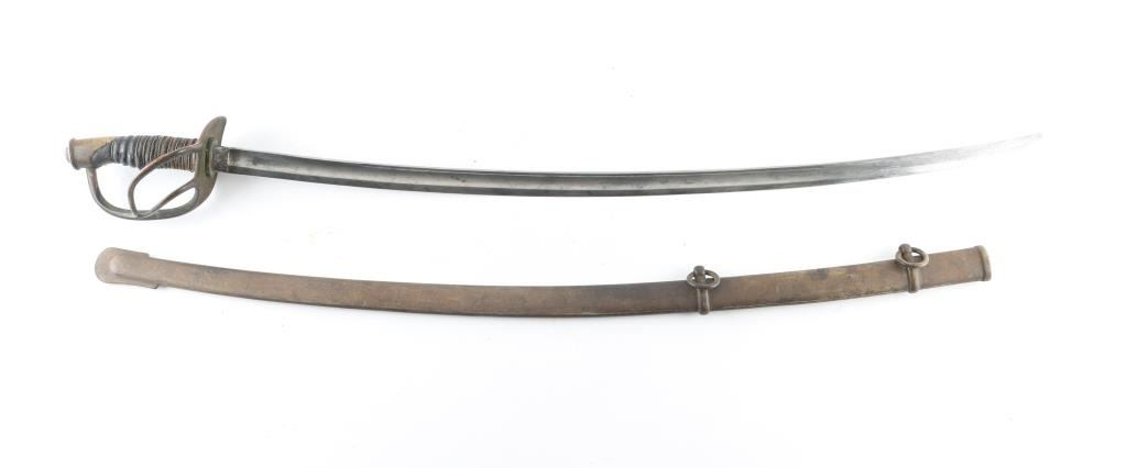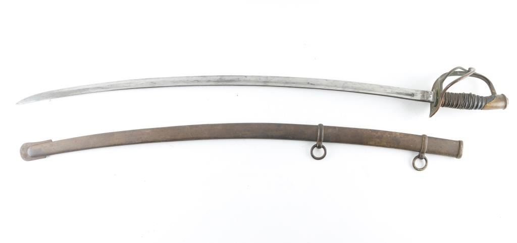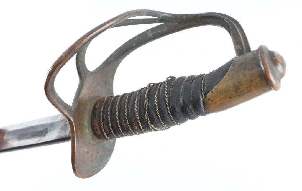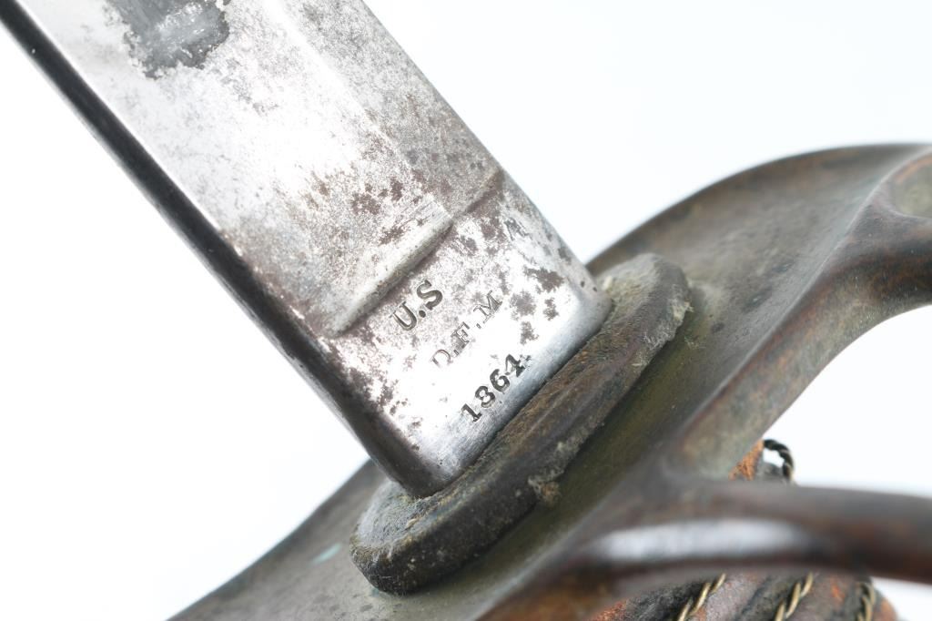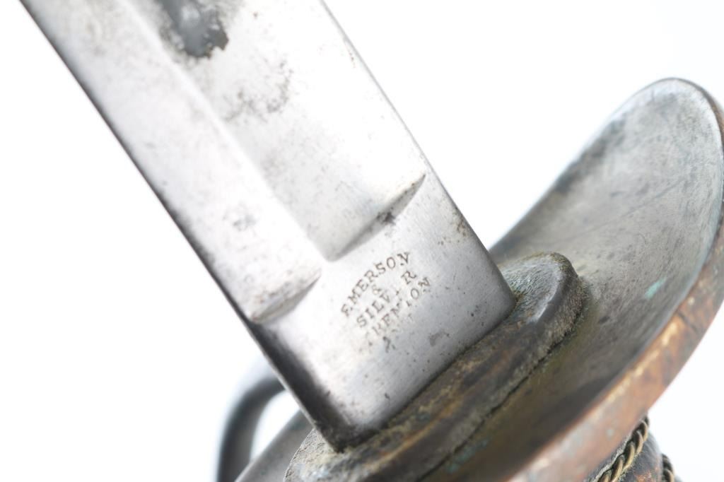 Made by Emerson, Lake and Silver dated 1864. Good clear markings and full inspection. Wire unraveling on good condition leather grip. Dark patina on guard and scabbard. Blade at least very good. An untouched original Civil War artifact.