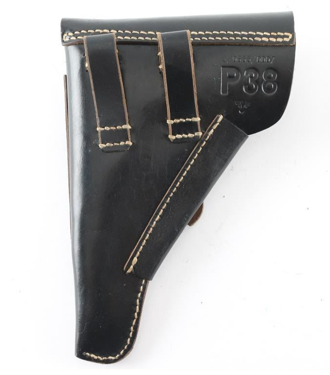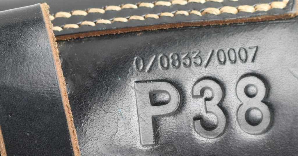 Third Reich era German Police holster for the P-38 Pistol. Soft shell. Black leather construction. Large "P.38" stamped on back, along with 0/0833/0007, with Police Eagle proof. Intact, excellent condition.