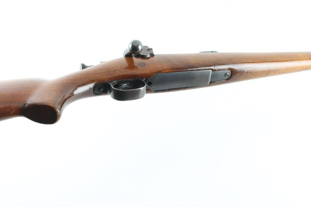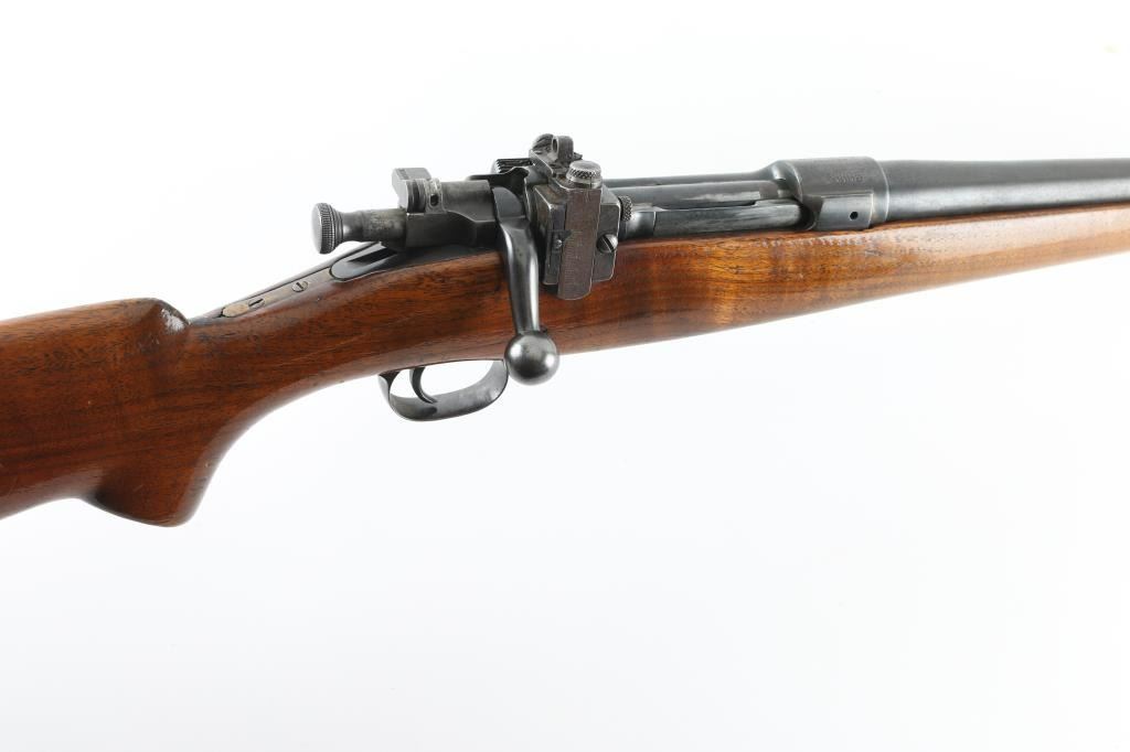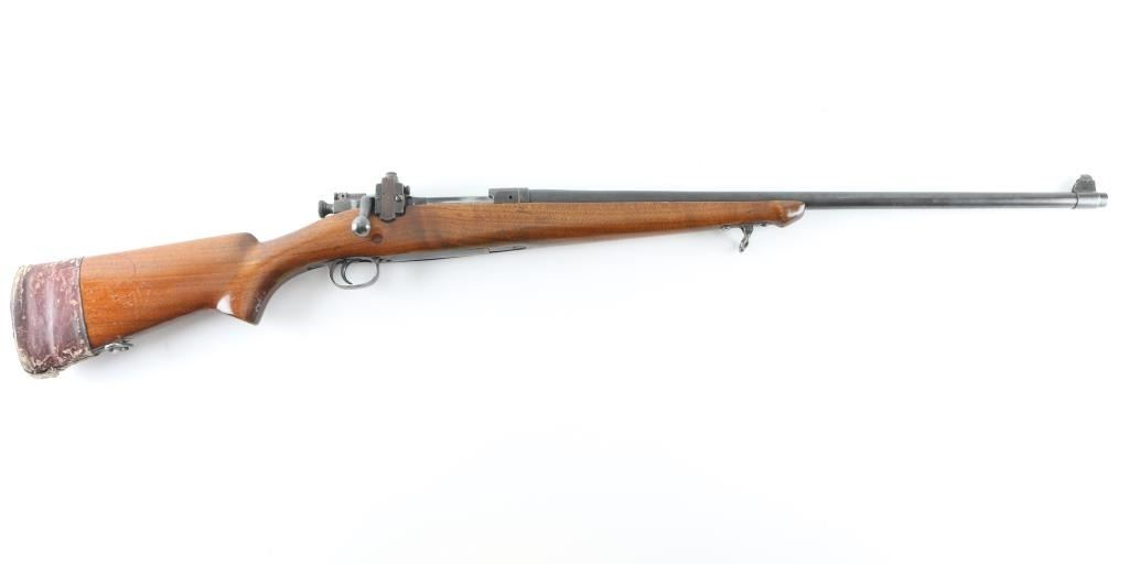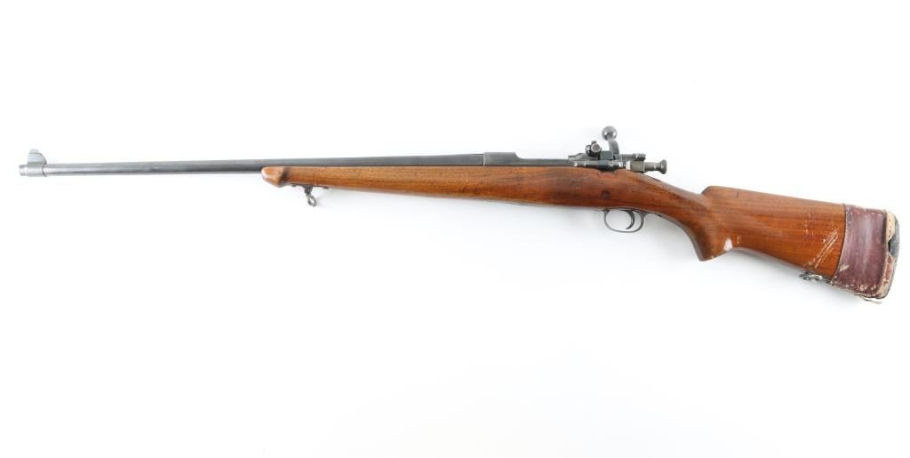 Sporterized US military bolt action rifle. Features 24" barrel (appears to be a military 1903A3 barrel), blade front sight, click adjustable receiver mounted rear peep sight, sling swivels (front appears to be a stacking swivel, with split in swivel), rubber butt pad, smooth wood sporter stock with splinter forend and schnabel tip, manual safety. Bore is poor to fair condition, dark and lightly corroded, might improve with a good cleaning. Metal surfaces retain 40% blued finish, majority coverage of a patina brown color, some patina or rust in several places. Wood is good condition, has added tang insert piece behind action. Butt is covered with a slip-on pad, appears to be leather sided, poor condition. Condition is NRA Good *** C&R Firearm ***