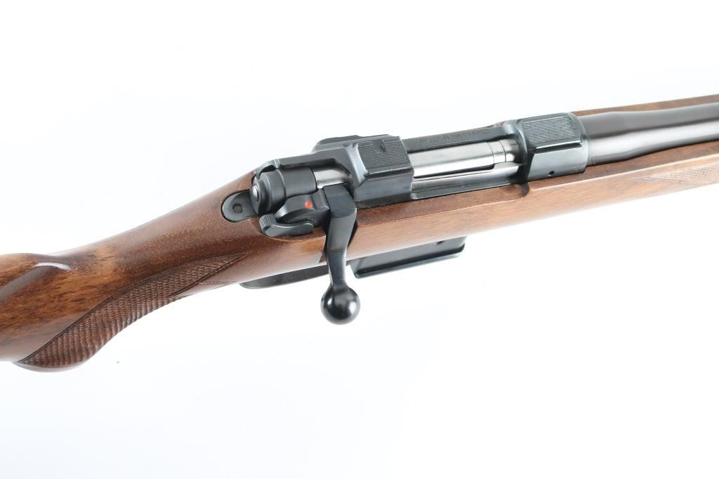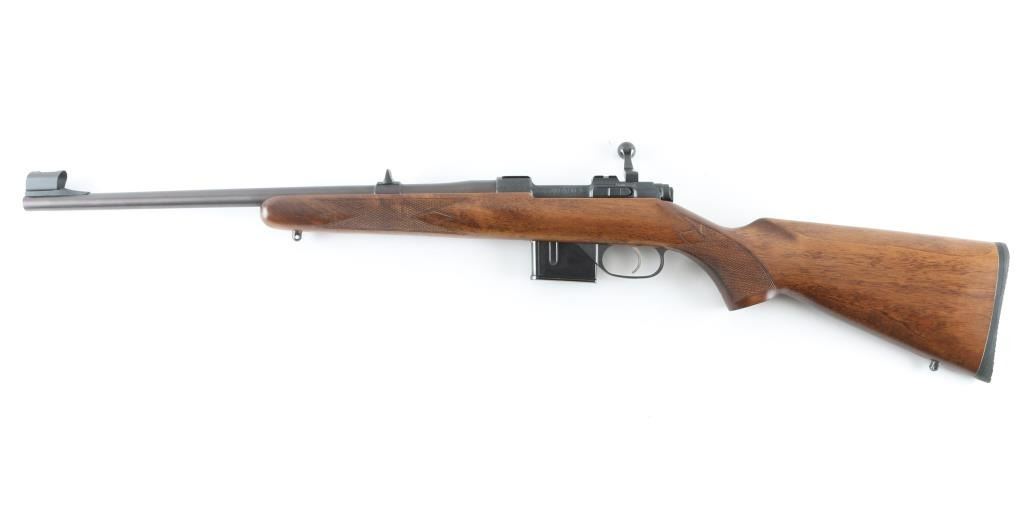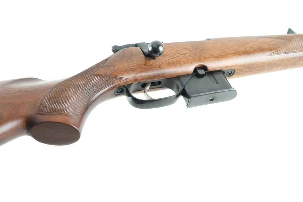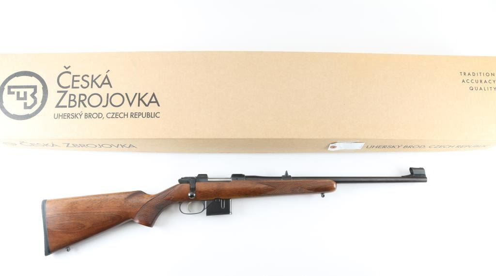 Czech bolt action rifle imported by CZ-USA, Kansas City KS. Features blued finish, wood stock with checkered forend & wrist, solid rubber recoil pad, 18.5"' barrel, hooded blade front sight, notch rear sight in dovetail on barrel island, dovetailed receiver for scope mounting, sling studs, manual safety, detachable magazine (one mag included). Overall condition is excellent with few signs of handling. Barrel shows a slightly plum color bluing. Includes factory cardboard box with manual. Condition is NRA Excellent *** Modern Firearm ***