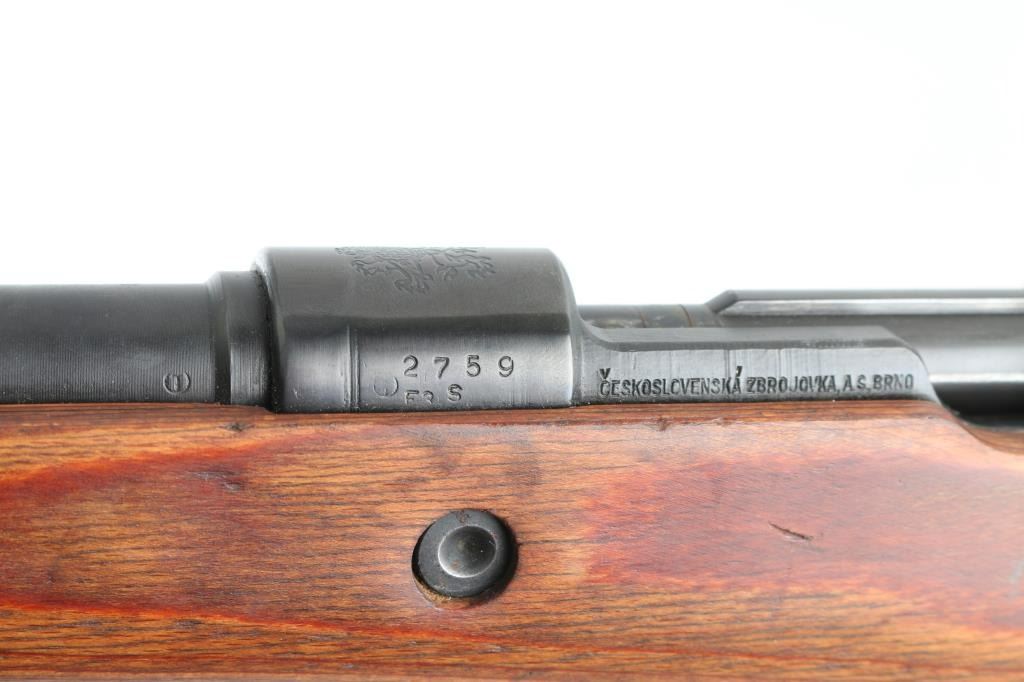 Rifle. Bolt-Action. 5-rd internal box magazine, 24": barrel with serrated ramp, triangle blade front, and tangent rear sights. "H" style front barrel band. Post-war rebuilds. Czech "Rampant Lion" crest on receiver ring, "Ceskoslovenska Zbrojovka, A.S. Brno" on sideplate. Czech proofs on receiver and barrel. Serial number matches on receiver, buttplate, triggerguard, floorplate, front barrel band. Underside of barrel stamped "Fed. Ord S.E.M. Ca." Import mark.. No cleaning rod. Bore appears rough/dark.. Wood stock/handguard are very good, with blued, cupped buttplate. Blued finish is about 98% with minor scratches/edge wear. . Action is crisp/tight. NRA Condition-Good. C&R Firearm.