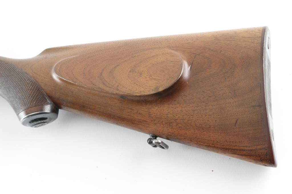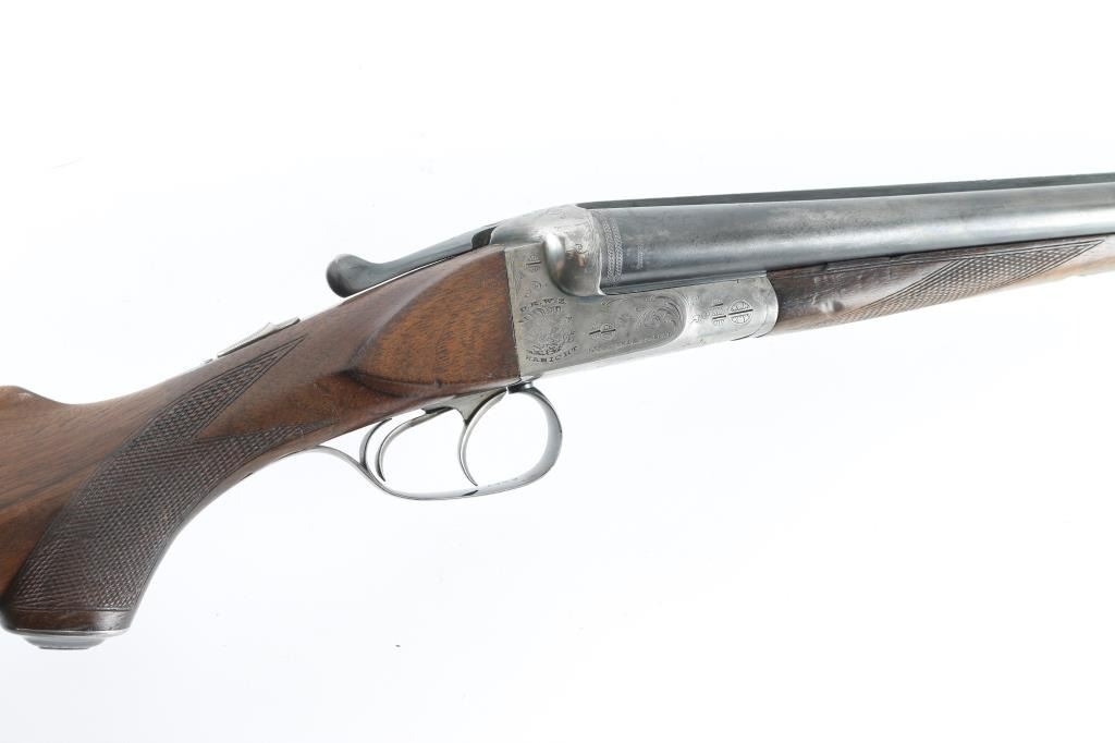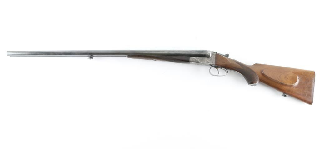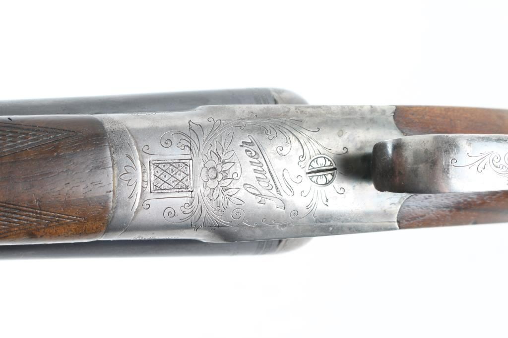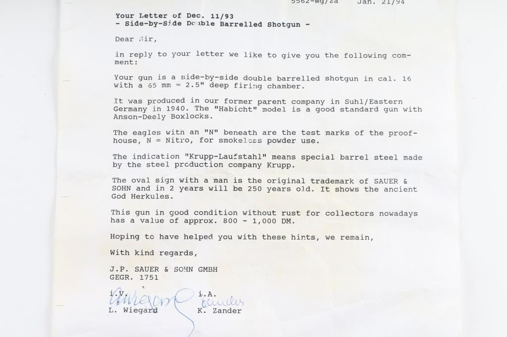 German boxlock hammerless double barrel side by side shotgun manufactured circa 1940. Chambered for 2-1/2" (65mm) shells. Features blued finish, case color receiver, walnut stock with pistol grip wrist, 27.5" barrels with fixed IM choke, single extractor, sling swivels, flat plastic buttplate, top lever, Greener type cross bolt, double triggers, tang mounted manual safety (resets to 'safe' on opening). Barrels feature narrow swivel screwed to underlug, brass front bead. Top rib appears to have a plugged hole for front bead slightly forward of current bead. Forend is secured by a latch, has checkered panels that merge at bottom. Stock has checkered panels at wrist, blued steel grip cap, pancake style right hand cheek piece. Length of pull is 14" to forward trigger. Bores are bright and shiny, several small areas of pitting appear polished. Bluing is 75% with edge losses, handling marks, several small touched-up areas with shallow pitting. Receiver shows fading case color with mostly silver color, engraved accents and "Lauer" on bottom of receiver, "DRWZ Habicht" with eagle on sides. Wood is good+ condition with dents and signs of field use. Includes Sauer factory letter. Condition is NRA Good+ *** C&R Firearm ***