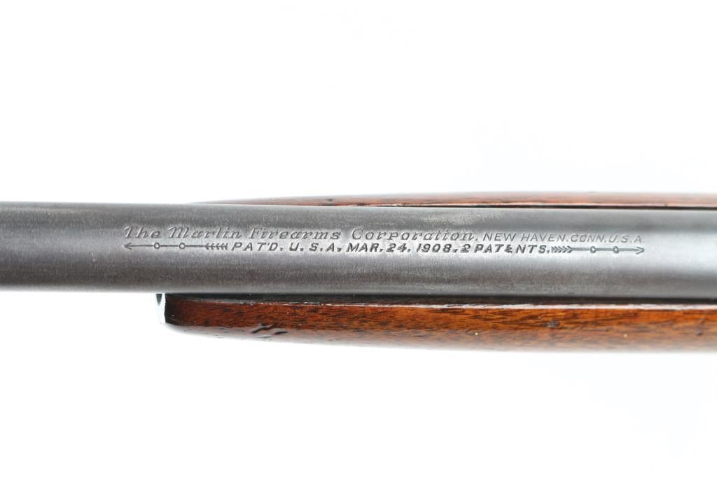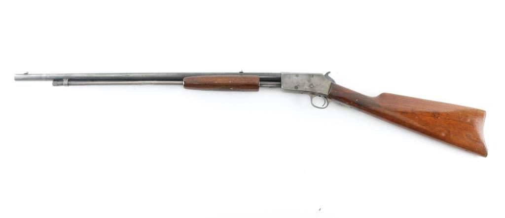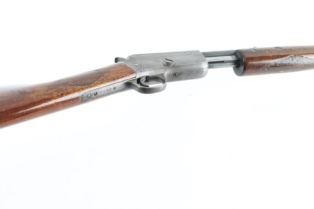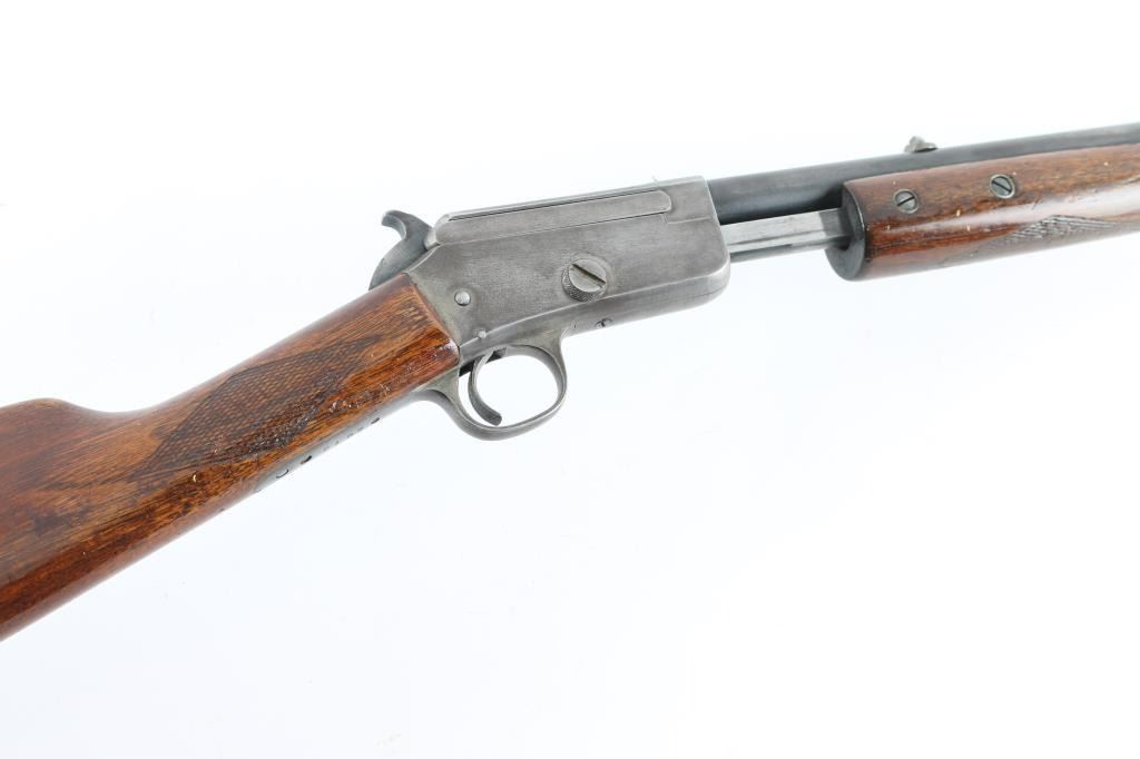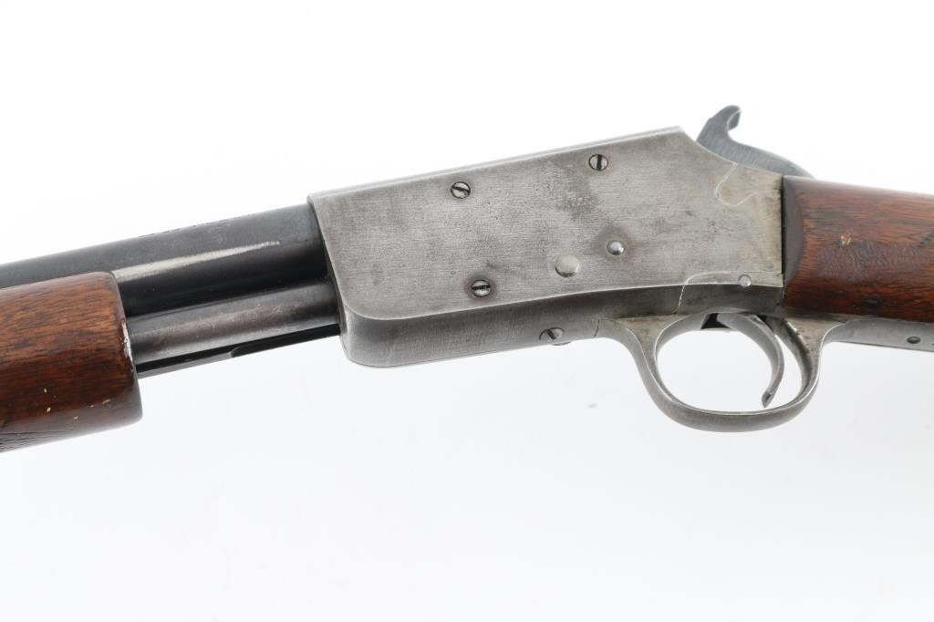 Rare and very collectable the Marlin No 47 was only offered in 1930-1931 as a gift to purchasers of 4 shares of Marlin stock for $100. It is a takedown version very much like the model 20 but the 47 has checkering on the buttstock and forearm and had a cyanide case-colored frame. This rifle has lost all case-coloring on the frame and bolt. The book Marlin Firearms by Brophy says it should have a 23" barrel this one measures 22" (others seen have 22" as well). This gun has dovetailed front and rear sights, tube magazine, smooth trigger and knurled hammer spur. The metal finish has lost most of the blue and has a grey patina on most. The wood stocks look fine for the age, no cracks but used. The stocks have been varnished or lacquered and there are specks of yellow paint(?) that should come off. The metal butt plate has significant surface rust. The bore looks good, dusty. LOP is 13.5". Condition is NRA Good *C&R Firearm*