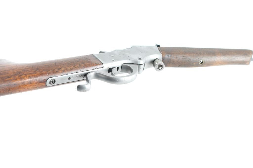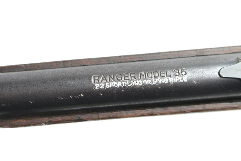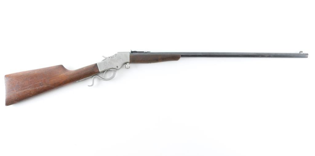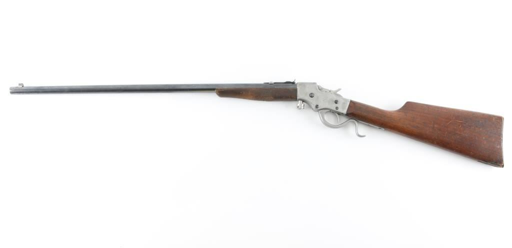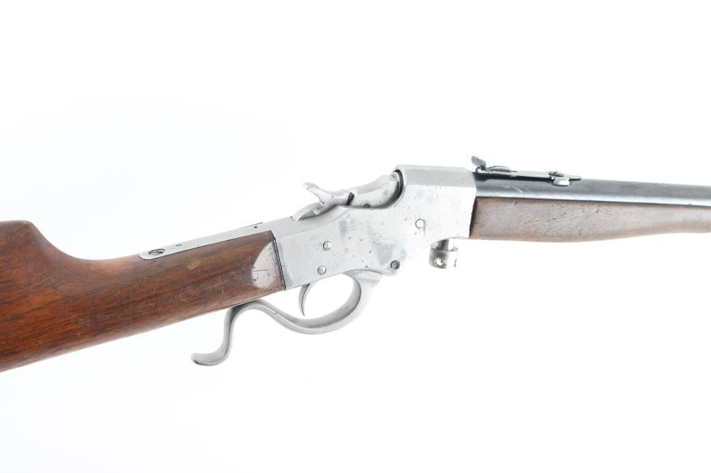 Vintage falling-block single shot rifle chambered in .22 S/L/LR cartridges, circa 1893-1939. Features a blued 23.25" take-down barrel (not original barrel), dovetailed blade front sight, adjustable rear sight, smooth trigger, 's' shaped lever, knurled hammer spur, smooth walnut forend and straight grip shoulder stock with curved grey metal buttplate. Receiver is in the white and looks to have been sanded at some point and not done well. This is a "Franken Firearm". The take down screw is not original. The butt plate does not appear to be original. The barrel is not original and is stamped on top "Ranger Model 35" and ".22 Short, Long or Long Rifle". The bluing on the barrel looks okay with some loss of finish and some scattered surface rust with a rough spot on the right side about 5.5" from the muzzle. The receiver needs some love. All things considered the wood stocks aren't bad, they do show use and wear with a chip out of the toe. Bore looks good, needs cleaned. LOP is 12.75". Condition is NRA Fair as not original. *C&R Firearm*