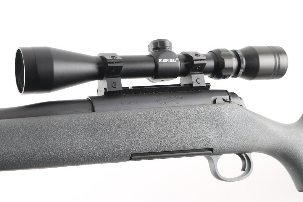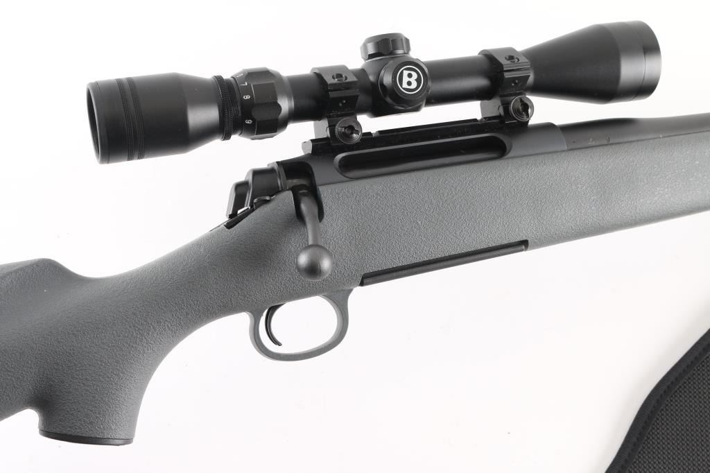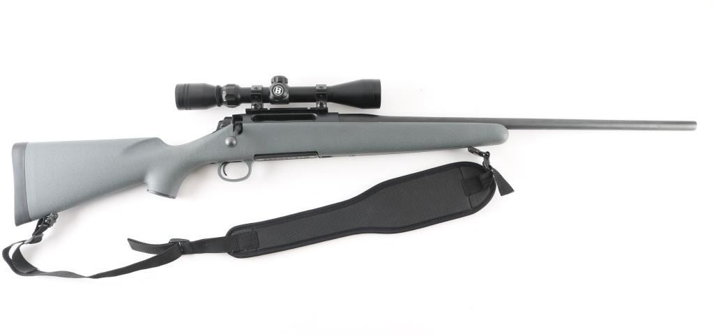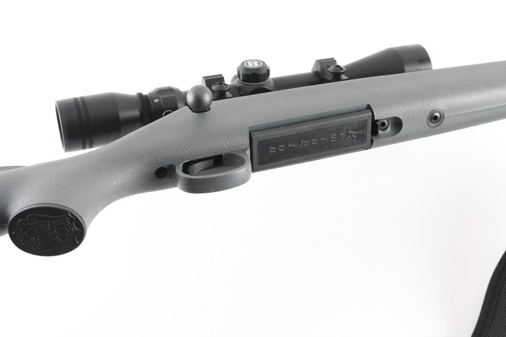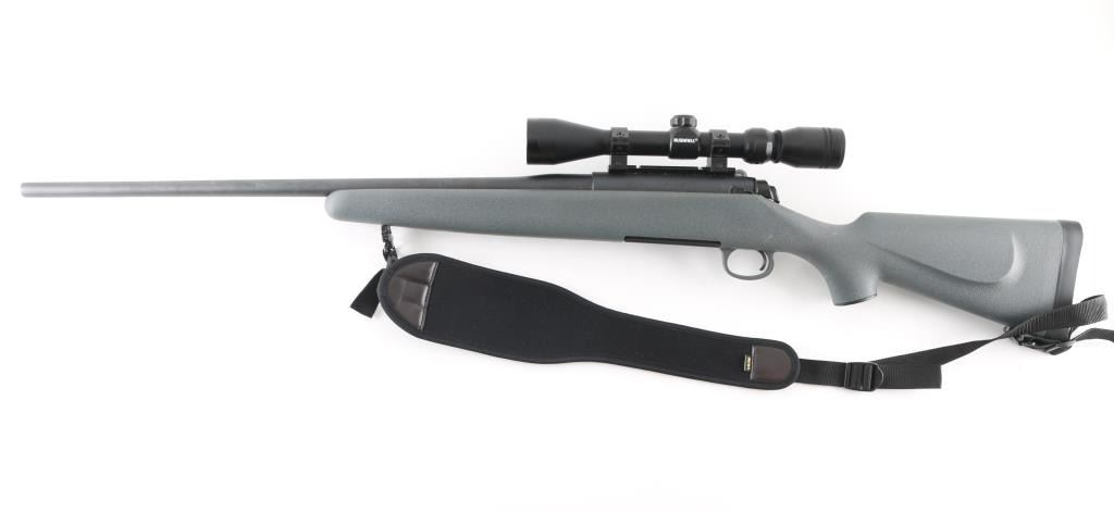 Bolt action rifle features matte blued finish, gray polymer stock with cheek rest, solid rubber butt pad, 24" barrel, weaver type one piece scope base, manual safety, detachable magazine and sling studs with sling. Bore looks very good. Overall appearance is like new with some signs of handling and use. Mounts a Bushnell 3-9x scope, optics are clear. LOP is 14". Metal finish is good with a couple of dings on the barrel and a couple of minor scuffs on the stock. There may be some minor rust on the scope base. Condition is NRA Very Good *** Modern Firearm ***