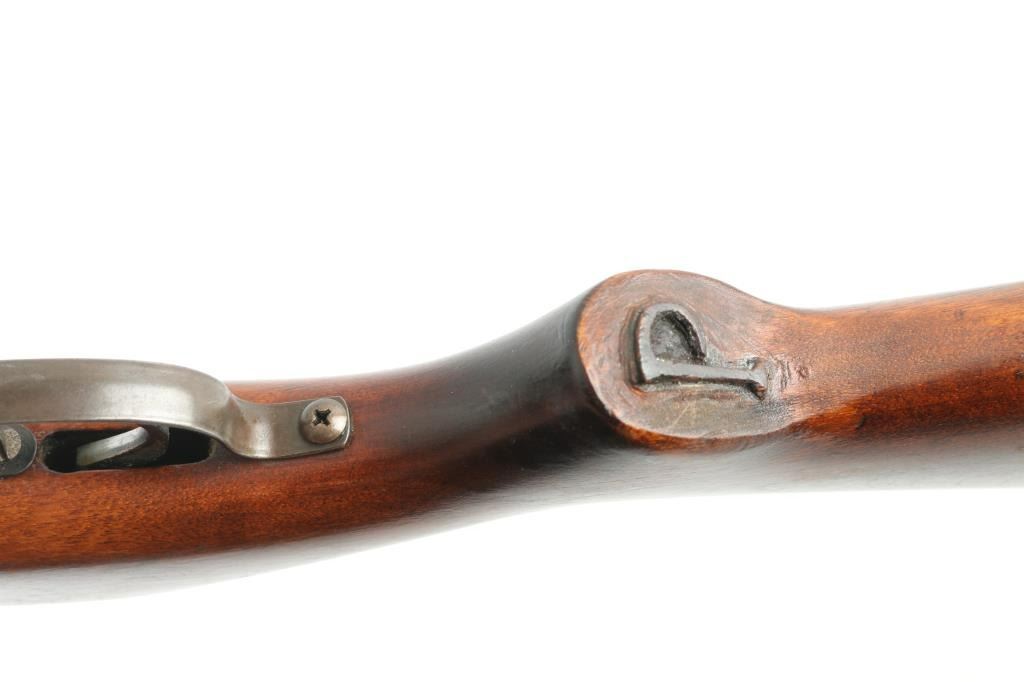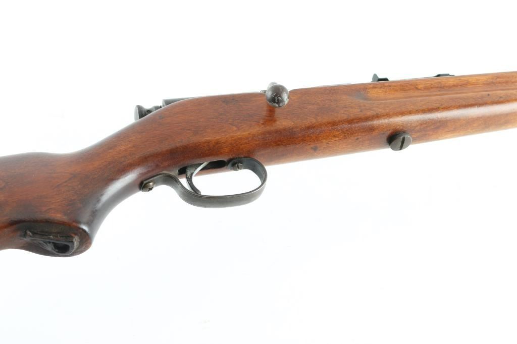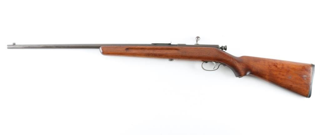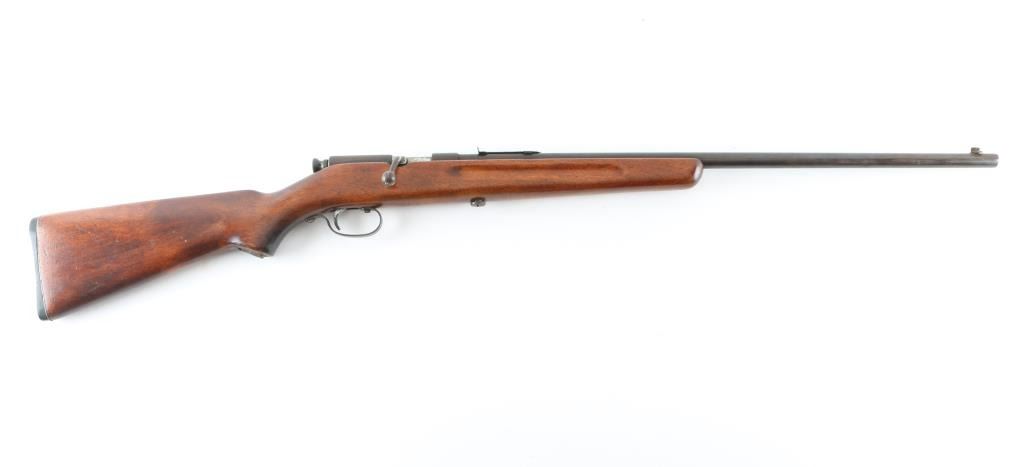 Vintage bolt action rimfire rifle chambered for .22 Short, Long or Long Rifle cartridges. These gun were made between 1935-1948. It features a 24" blued barrel and receiver with a dovetailed front sight with an adjustable rear sight but the adjustment is missing. It has a one piece wood stock with finger grooves in the forearm and a metal buttplate. Someone put a black plastic butt plate over the metal one. There is also a "P" carved into the wood where a grip cap would be. Metal finish looks okay but is not blue anymore and is a brownish patina. The chrome (?) finish on the trigger is flaking off. The wood stock looks good, no cracks or chips but it appears to have been varnished (?) at some point. You can see where it ran on the shoulder stock. Bore looks good. LOP is 13.5". Condition is NRA Good *C&R Firearm*