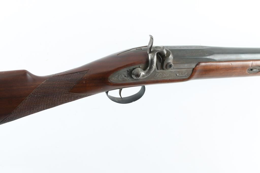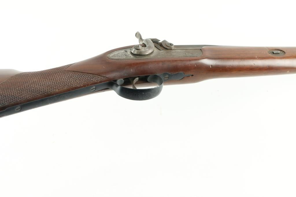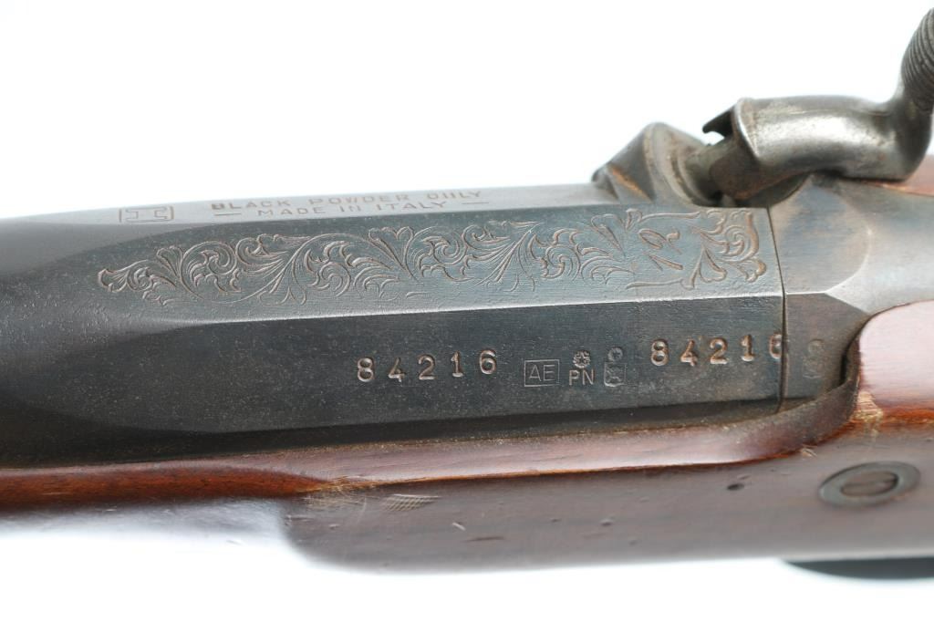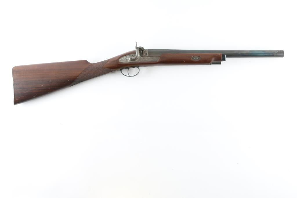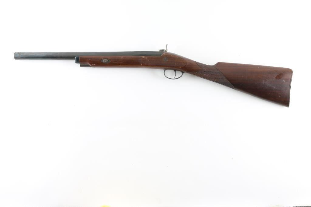 Italian made Black Powder 12 Ga, Shotgun that has been mortified by shortening the 32" round/octagonal barrel, cut down to 17.5", no sighting bead, no ramrod. Hardwood stock with steel buttplate, checkered wrist. . Two cock hammer locks up tight. Bore appears dark/rusty. Wood is good, minor scratches, Metal finish has dulled, with areas of rust/pitting. NRA condition-Fair/Shortened Barrel Antique firearm