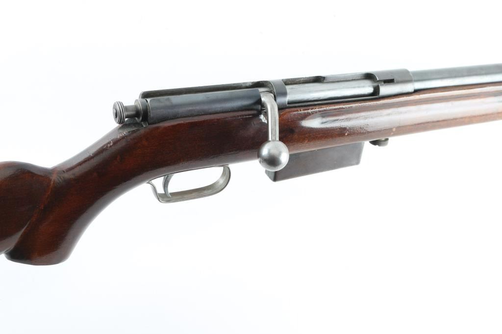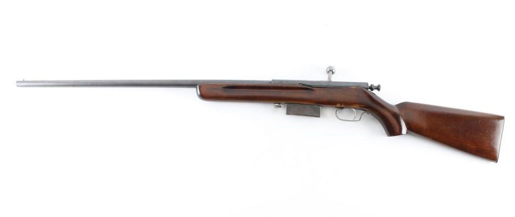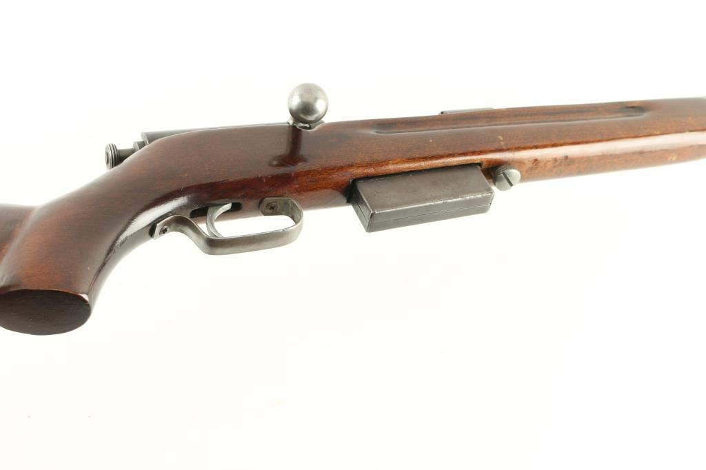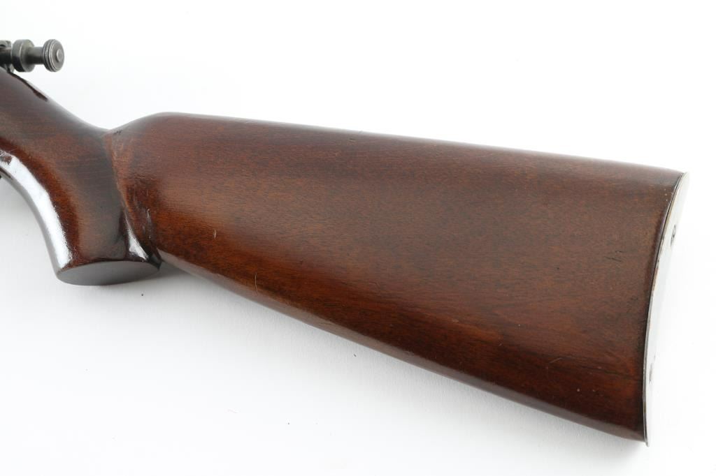Made by Mossberg for Montgomery Wards in the mid 1930's thru the mid 1940's. This is a bolt action shotgun chambered for 3" .410 shells that has a 24" blued barrel with a steel bead front sight, smooth trigger, metal trigger guard and fixed box magazine. The plain one piece wood stock has a finger groove on both sides of the forearm and a smooth metal butt plate. The metal finish is mostly a grey or gunmetal patina with some surface rust and possible minor pitting in spots. Wood stocks are fine with some rubbing and minor scratches but does appear to have been varnished at some point. There is a chip missing between the front of the magazine and the take-down screw on the bottom of the stock. Bore looks filthy. LOP is 13.75". Choke measures Improved Modified with a choke tube gauge. Condition is NRA Fair *C&R Firearm*