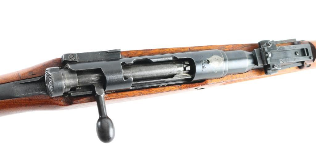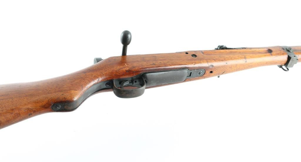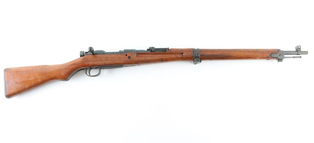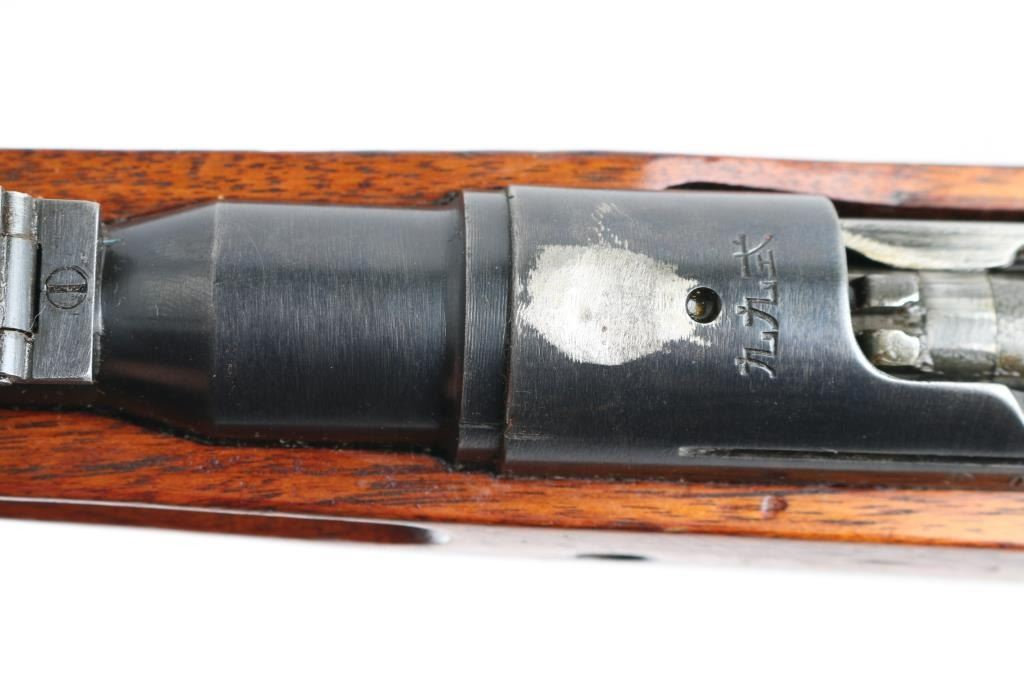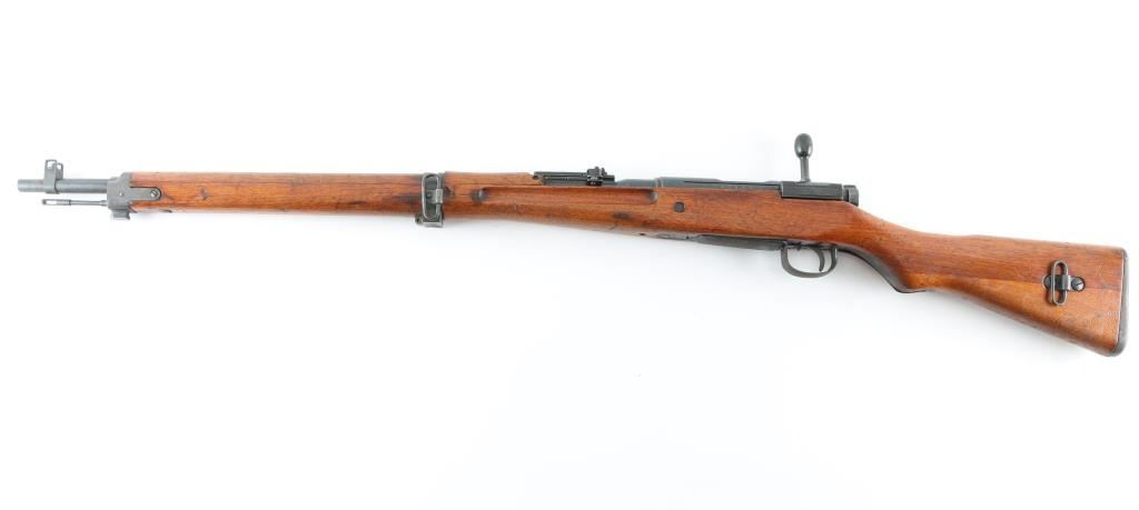 Rifle. Bolt-Action. Arisaka. '37th Series' Produced by the Tokyo Juki Kogyo arsenal (Kokura) Ground Chrysanthemum. Japanese military WW2 issued. Features 25.5" barrel, cleaning rod, bayonet lug, blade front sight with protector ears, peep rear sight with elevation ladder & anti-aircraft wings, no monopod, hinged, manual safety, side mounted sling swivels, straight bolt handle, hinged floorplate. Steel buttplate. Serial number on receiver only. Bore is very good condition, strong rifling. Retains 80% blued finish, with patina on the floor plate, buttplate, rust spots on the triggerguard, and lower tang. friction wear on the bolt. Wood is good condition with normal small dings and dents. No import marks observed. NRA Condition-Near Very Good. C&R Firearm.