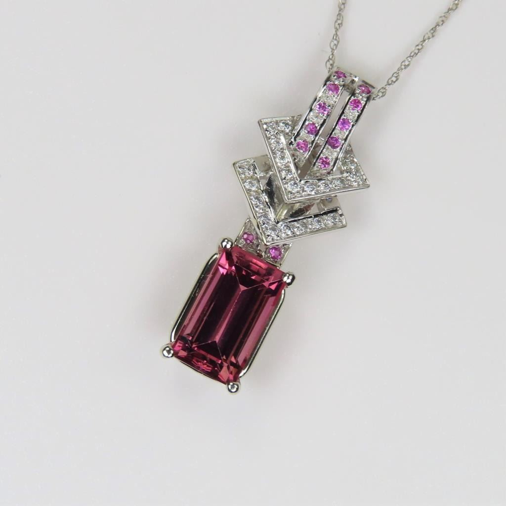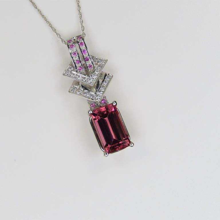 and Pink Sapphire Pendant featuring an intense Pink colored emerald cut Tourmaline weighing approx. 4.00 carats with VS clarity accented with 36 Diamonds and Pink Sapphires set in a stylish setting crafted in 14 karat white gold.