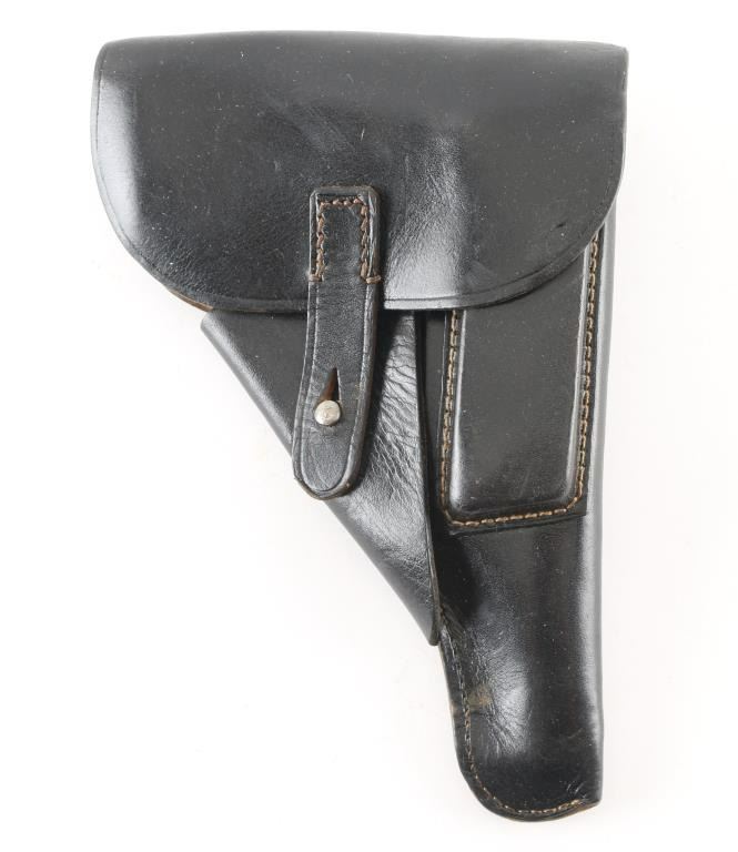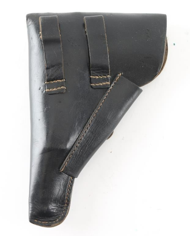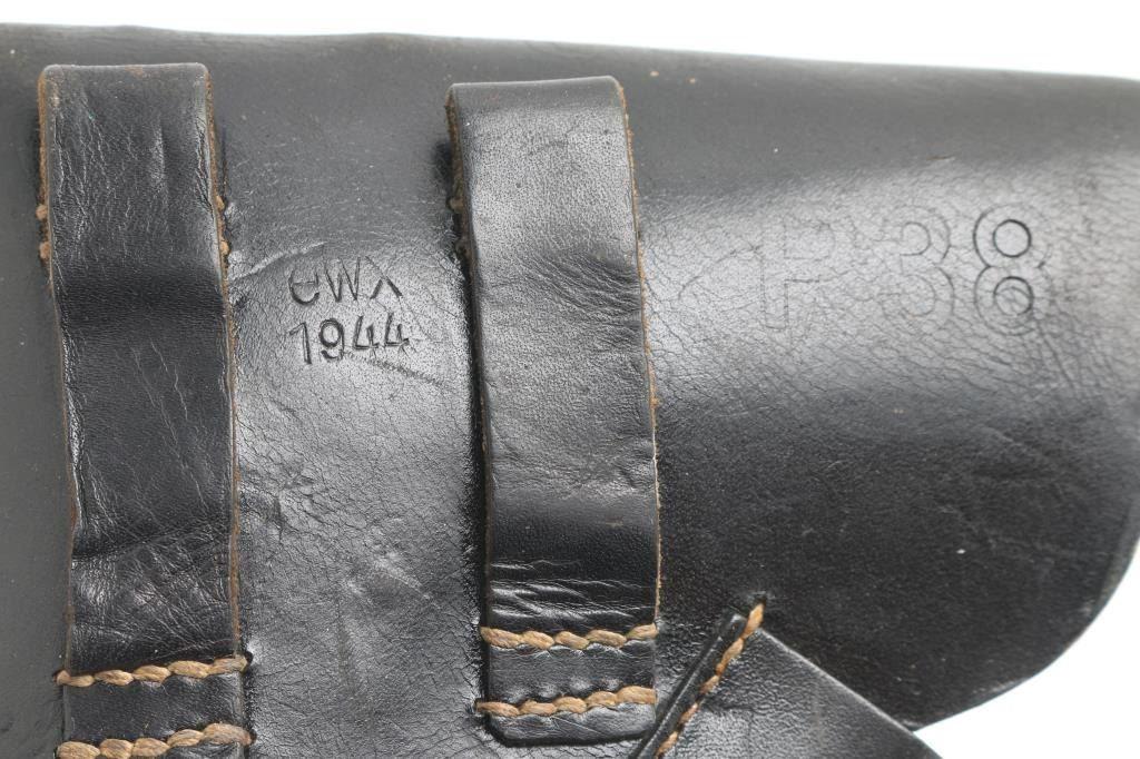 Third Reich era German Military/Police holster for the P-38 Pistol. Soft shell. Black leather construction. Large "P.38" stamped on back, along makers code "ewx", dated 1944 , no waffenamt. Intact, very good condition.