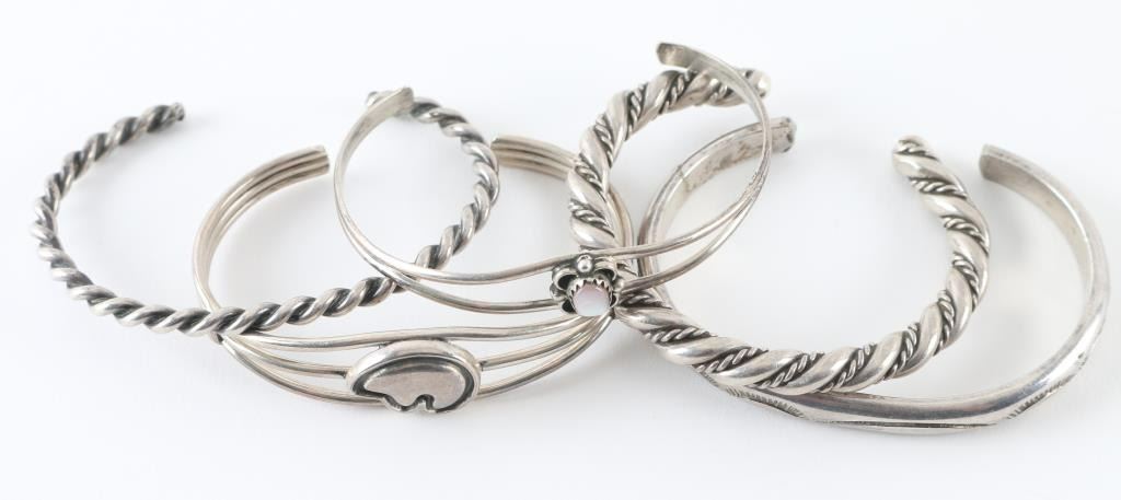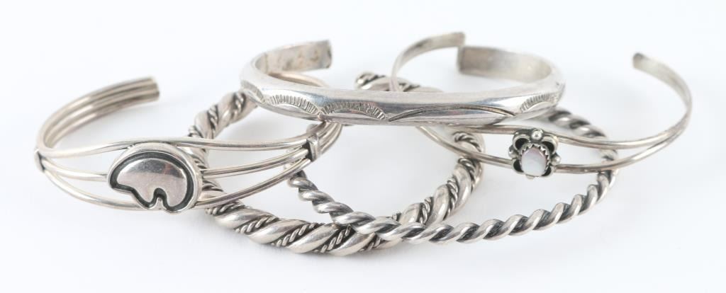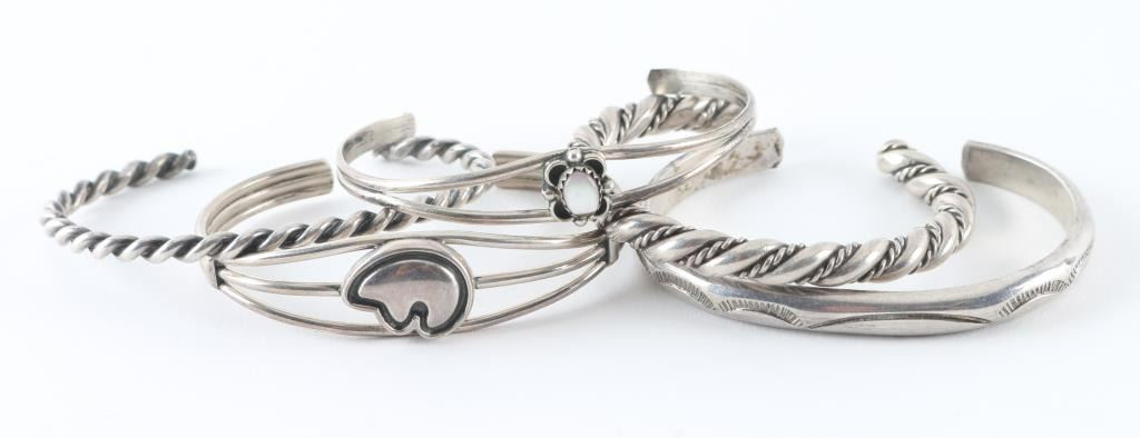 Includes 2 twisted cuffs, stamped Navajo design cuff, a bear effigy cuff, and a mother of pearl cuff. All various sizes.