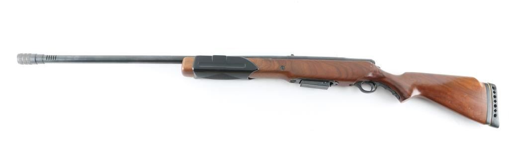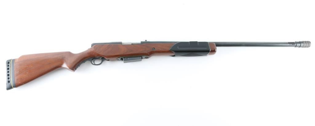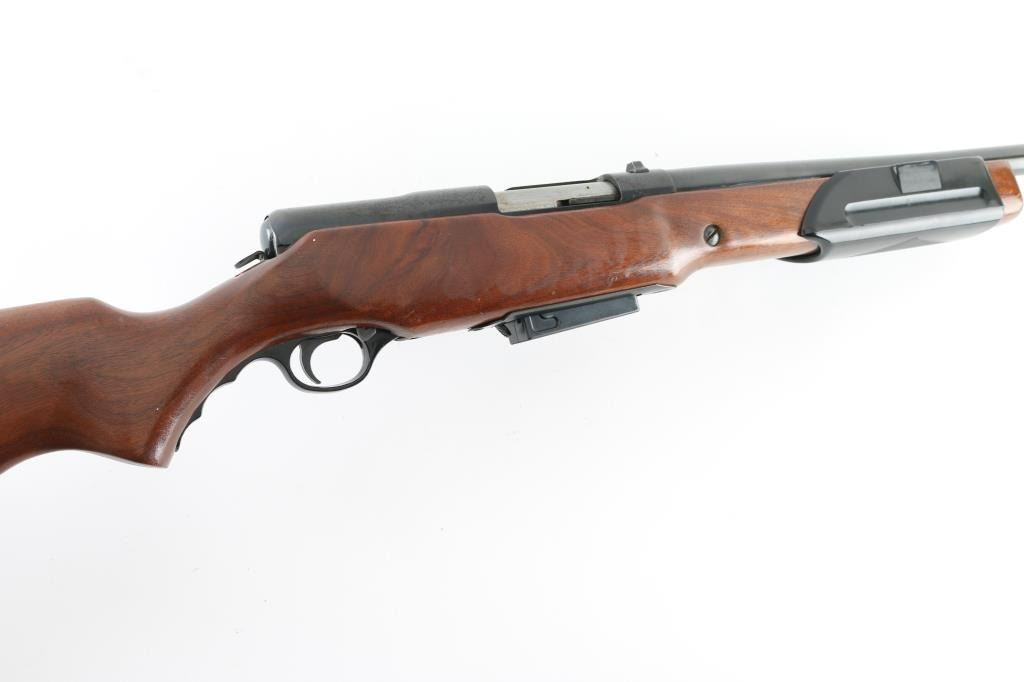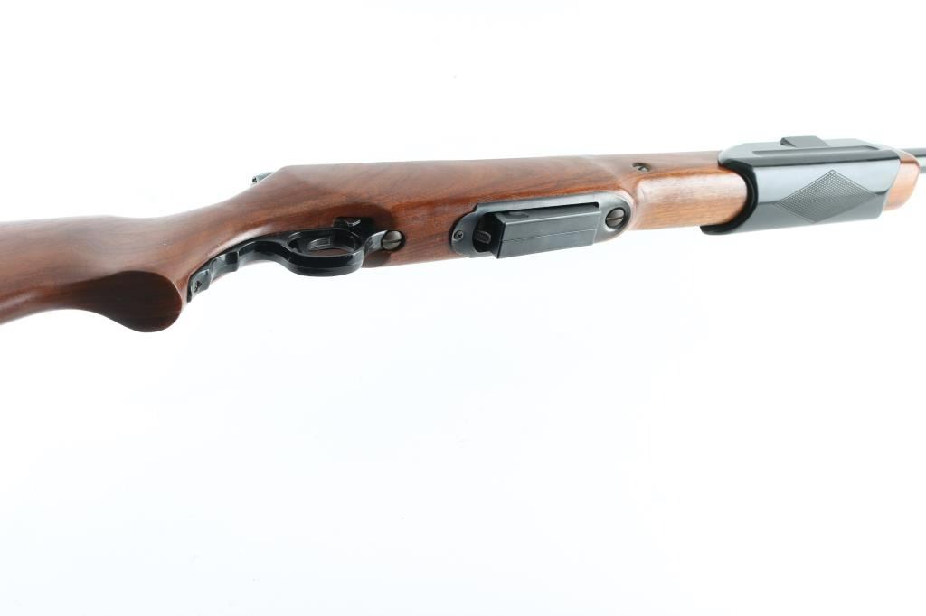 American made box feed pump action shotgun chambered for 2.75" 12 gauge shells. Mossberg apparently only made these for two years1955-1956. The design is different than most other pump action shotguns, the fore-end does not slide along under the barrel. It’s a piece of steel integrated into the stock with a black nylon fore-end that is the pump handle. It features a ported 28" blued barrel and receiver with a steel bead front sight behind the C-LECT-CHOKE, a dovetailed rear top serrated sight post, 3 round detachable magazine, tang safety (the red and green inserts are missing) and a serrated trigger inside a black plastic trigger guard with finger grooves. The smooth one piece wood stock has a rubber recoil pad and black spacer. Metal finish looks good with some surface rust on barrel and receiver. The wood stock looks fine with signs of handling and a small amount of white residue (?) that should come off with a little TLC. Bore looks good, dusty. LOP is 14". Action is sticky. Condition is NRA Good+ *C&R Firearm*