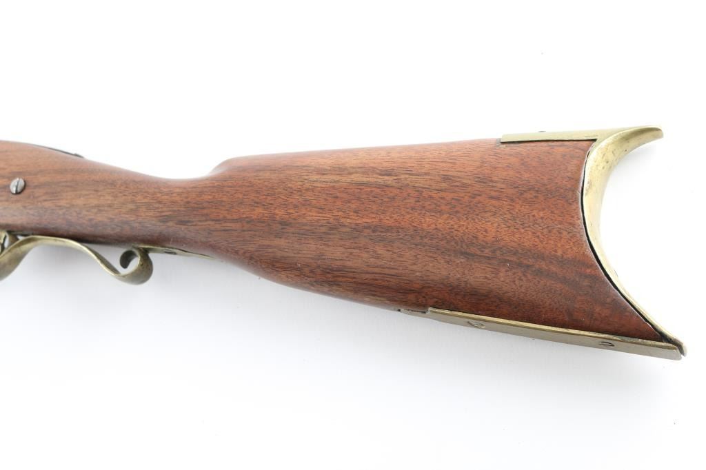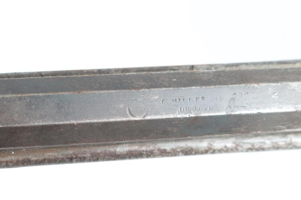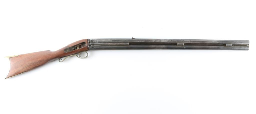 Over-under "Mule Ear" marked "C.Miller honeoye" in two lines on top of BBL. Missing lock and hammers with stock showing scratches in need of repairs, nipples have been replaced, approx 42-45 cal rifled over 16 gauge (No Ramrod) showing some partial restoration began at breach end where it is bright and nipples replaced.