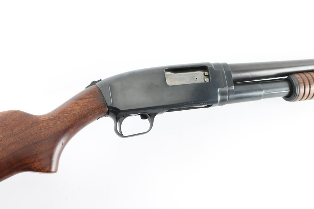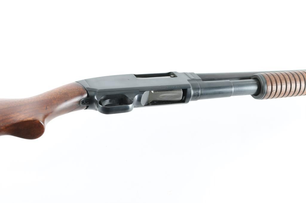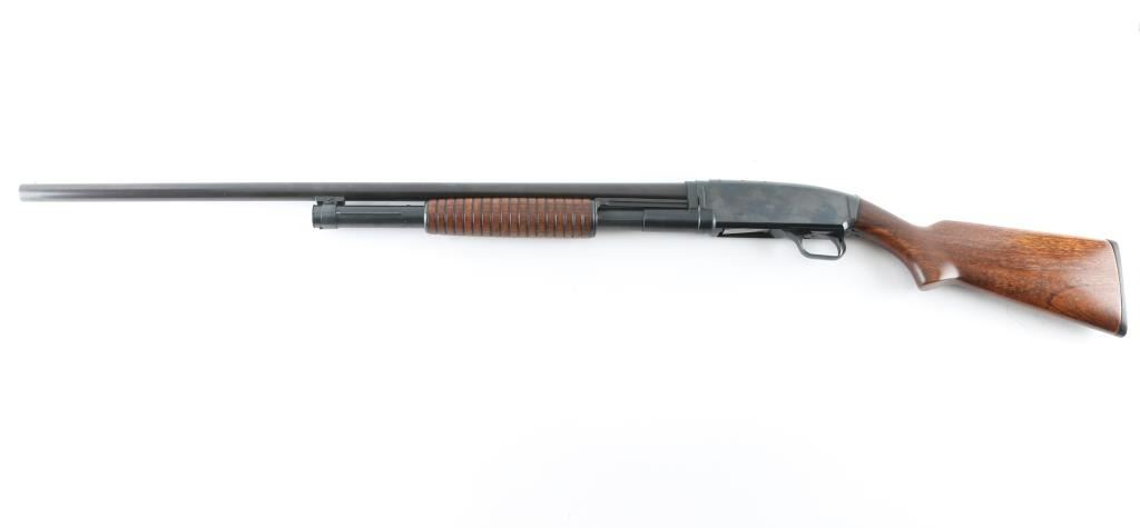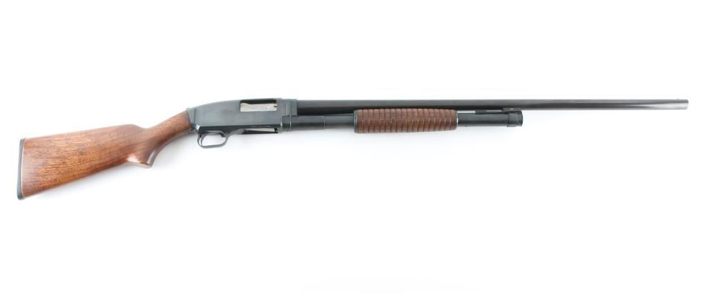 Pump shotgun marked "Utica New York" 1950-60's production resembling model 12 Winchester. Very good condition overall. Small crack at wrist. C&R Firearm
