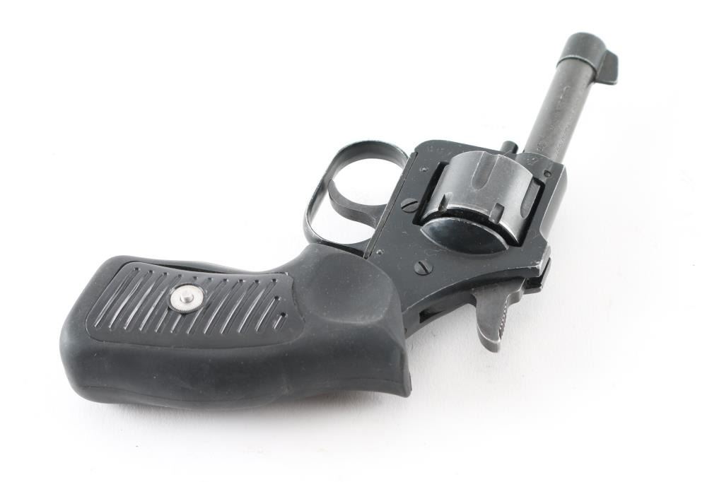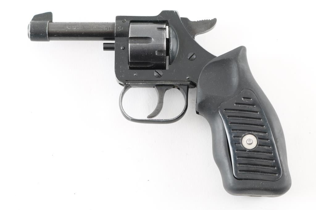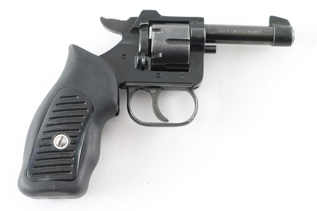 Made in Germany this is a 6 shot double action revolver chambered for .22 Short only. It offers a blued 2.5" barrel and frame with fixed blade front sight and cut in notch rear sight. The grips have been replaced with grips from a Ruger SP101 for some reason giving the gun an odd look. The gun is also missing the ejector rod but doesn't seem to interfere with operation. Gun looks used but good. Bore looks good. Condition is NRA Fair *Modern Firearm*