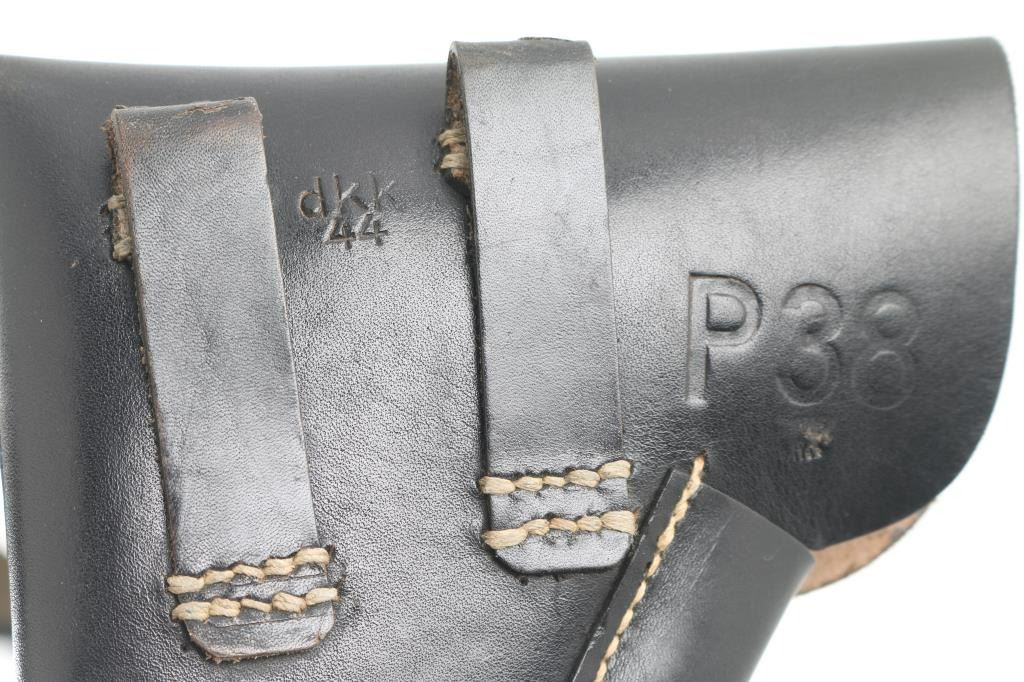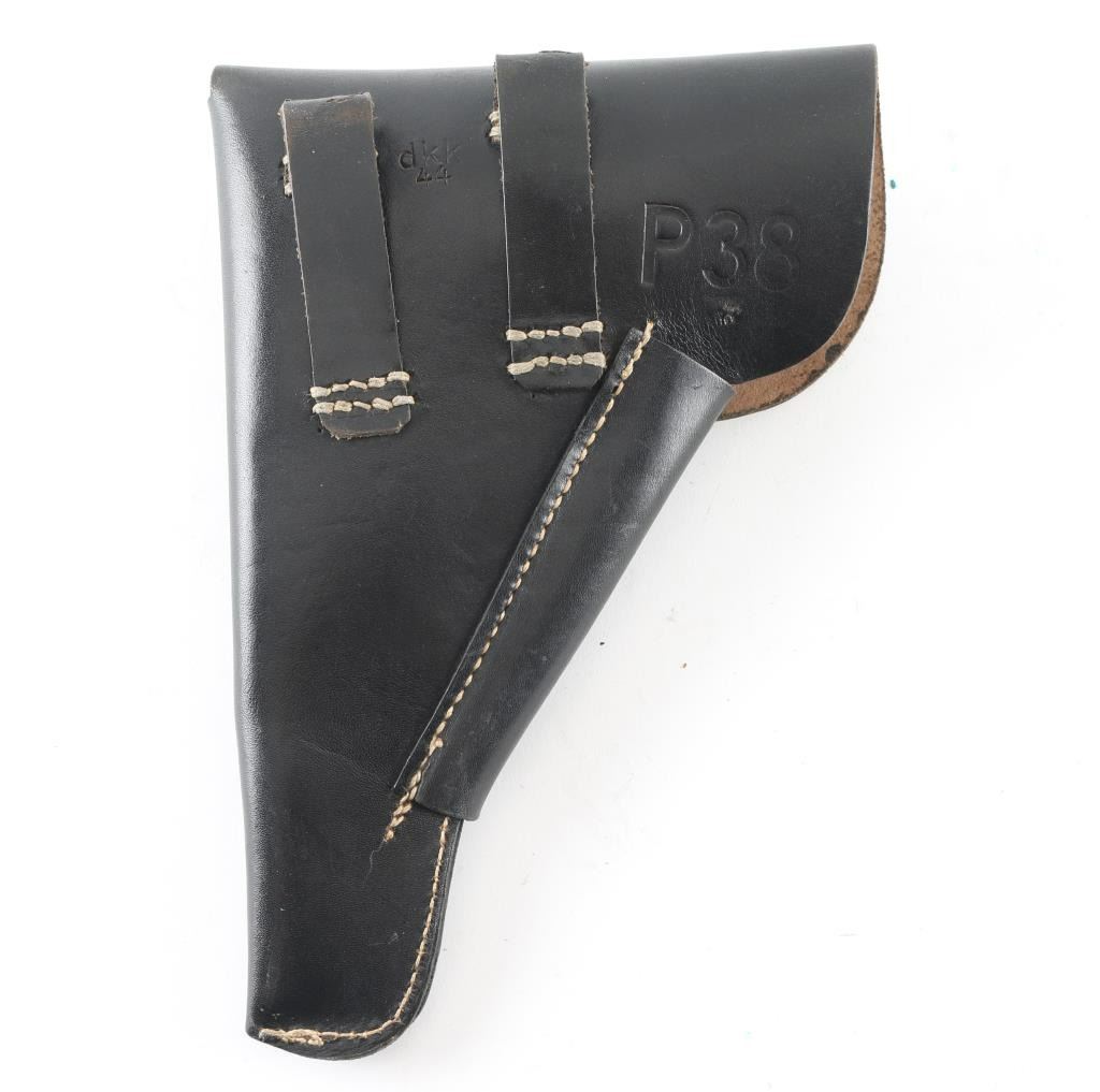 Third Reich era German Military/Police holster for the P-38 Pistol. Soft shell. Black leather construction. Large "P.38" stamped on back, along with makers code "dkk", dated 1944, No waffenamt. Intact, very good condition.