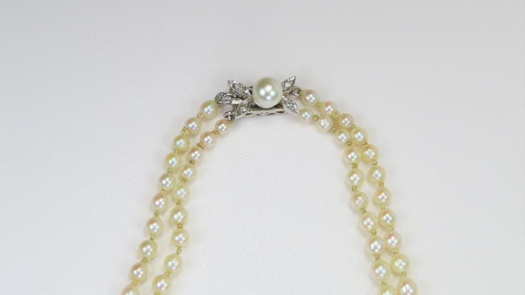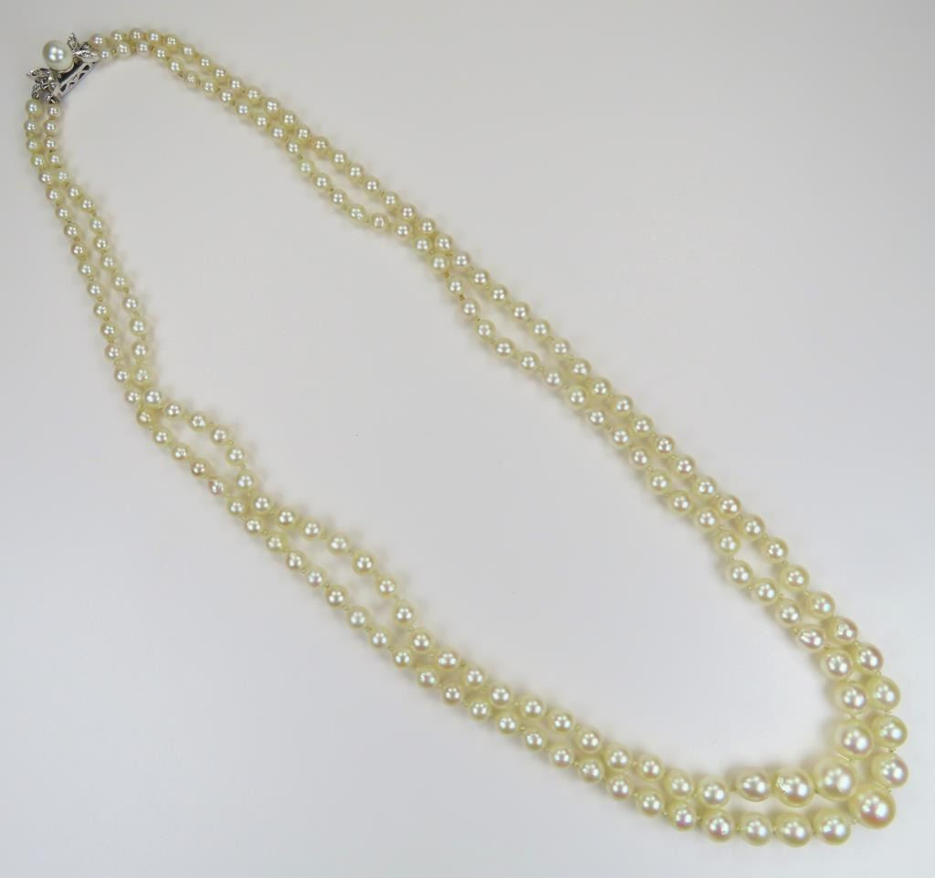 featuring Ivory Pearls graduating from 3.00-7.00 MM in diameter with wonderful luster accented with a detailed Pearl and Diamond 14 karat white gold latch, necklace measures 18 inches in length.