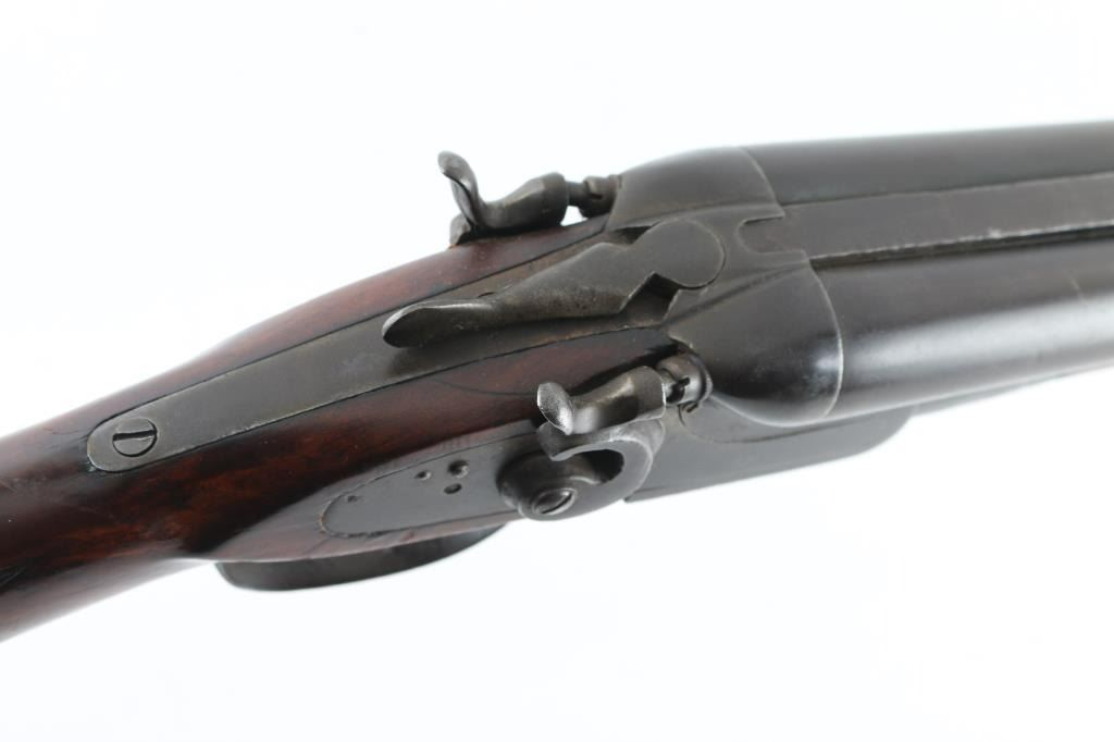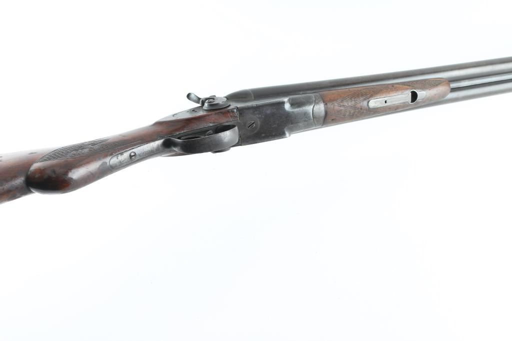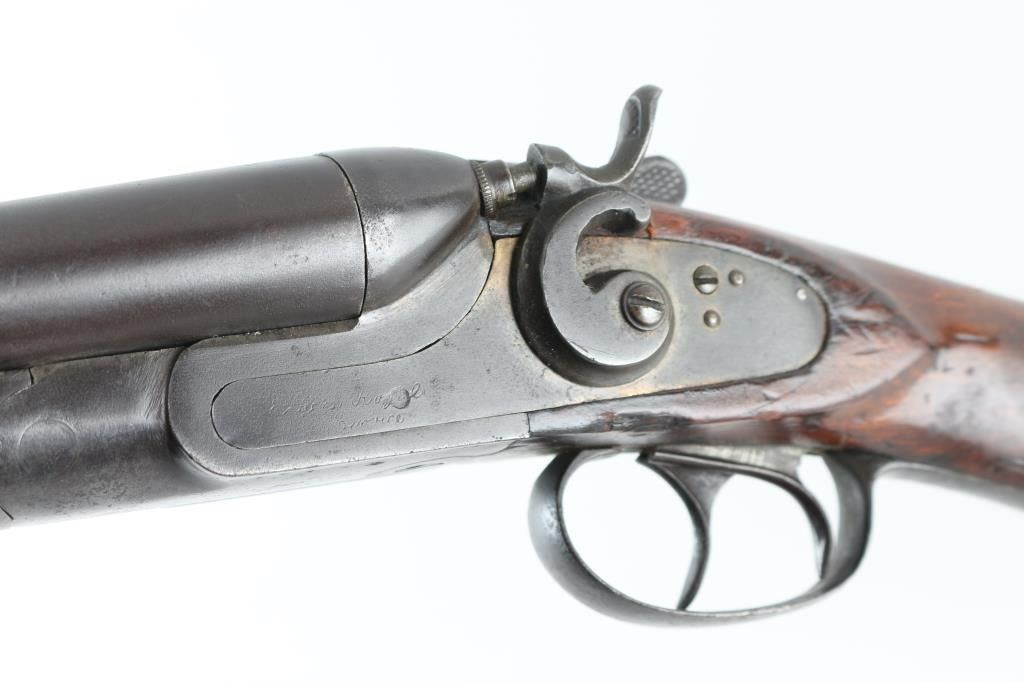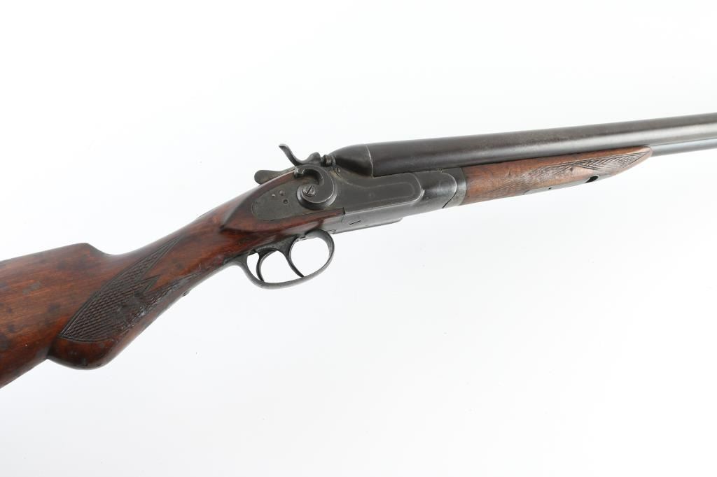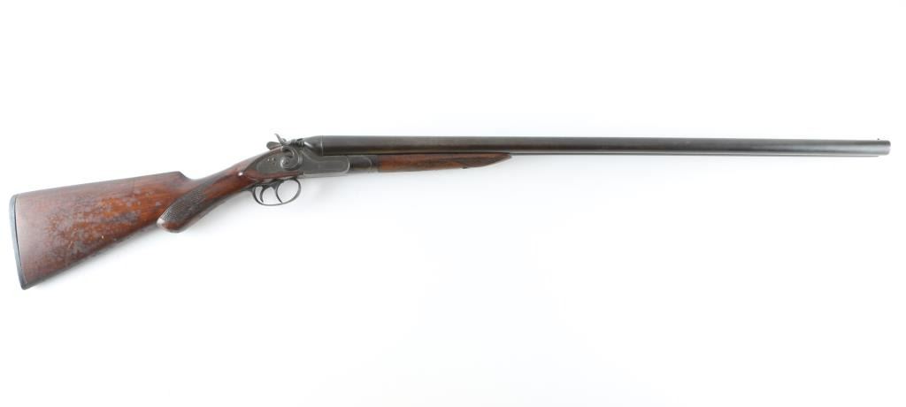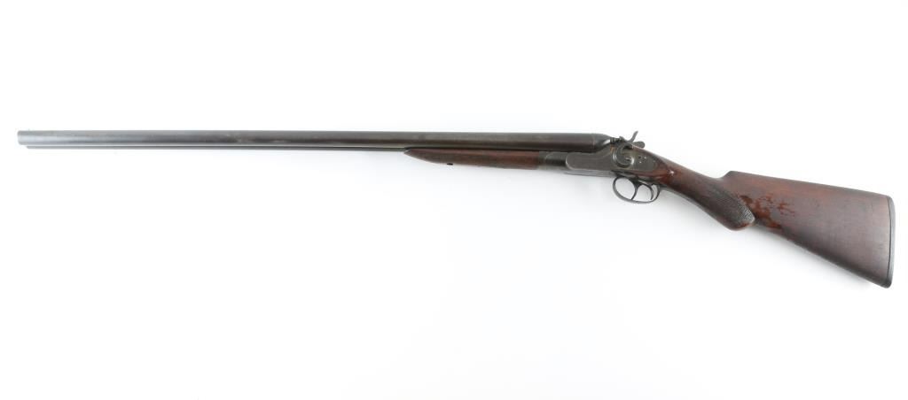 Trade name double barrel side by side shotgun with side locks and exposed hammers, likely made by Crescent Firearms Co circa 1914. Features 29.5" barrels, choked Full/IC, double triggers, brass bead front sight, splinter walnut forend & Prince of Wales gripped shoulder stock, cross hatching on wrist & forend, checkered black hard rubber buttplate. Bores are good condition, need cleaning. Metal surfaces show full coverage of patina brown color. Wood is good overall, no visible cracks, many small dents, finish losses on butt. Action operates properly. Numbers match on barrels, forend & hanger. "Royal Service" visible on left lock plate, thin and mostly eroded. Condition is NRA Good+ *** C&R Firearm ***