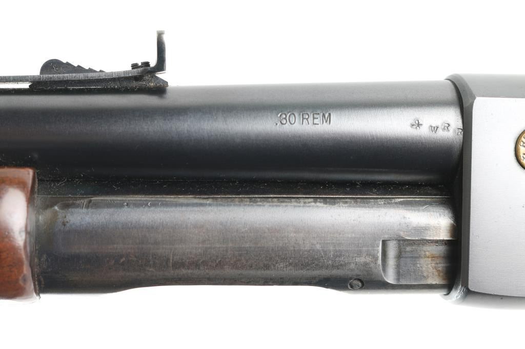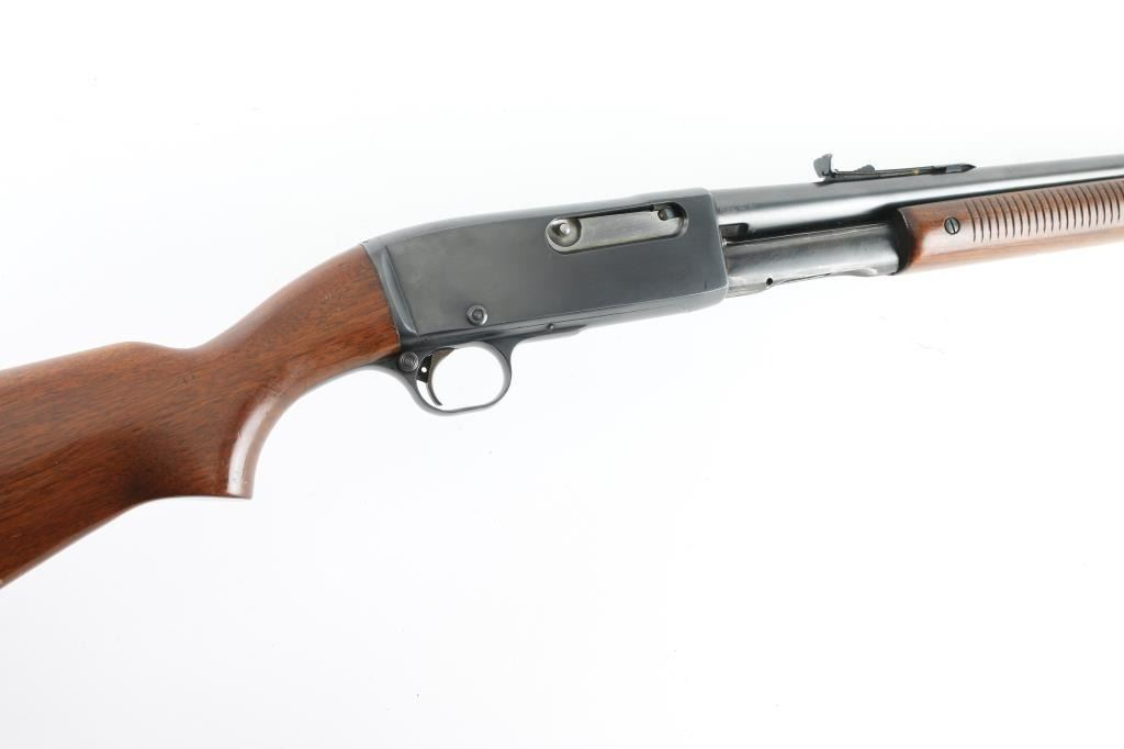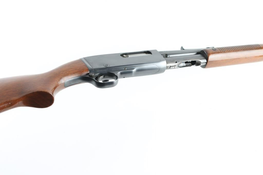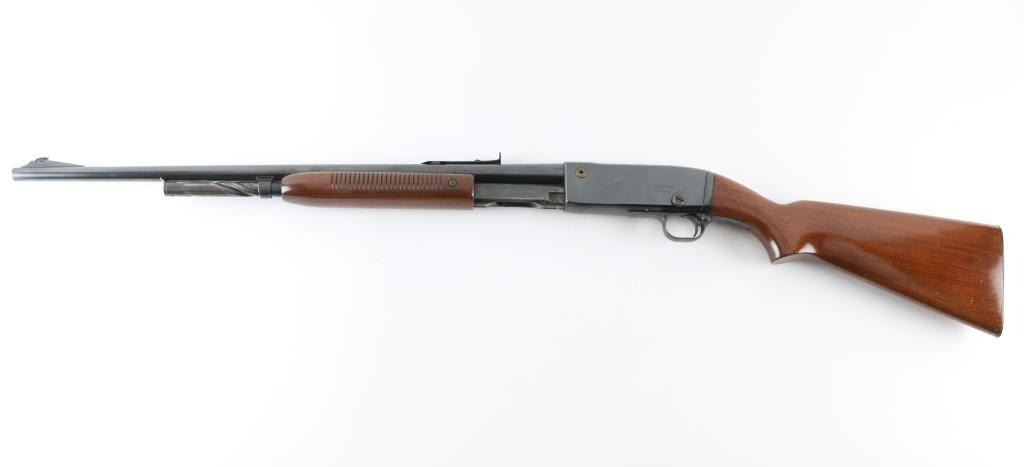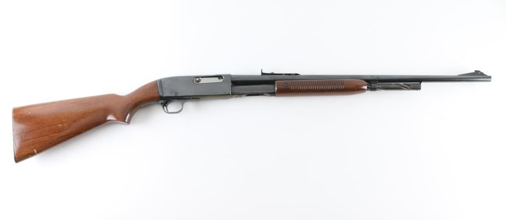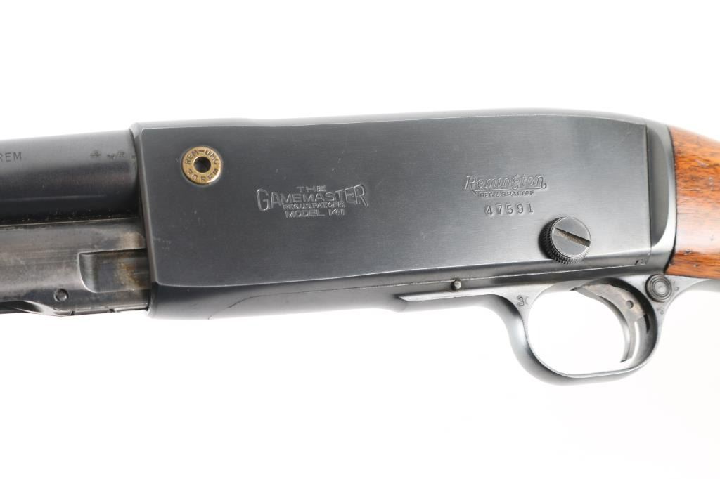 'Gamemaster' take-down pump action rifle, manufactured circa 1946. Features blued finish, smooth semi-pistol grip stock, grooved wood pump handle, 24" barrel, blade front & sporting rear sight, tube magazine, push button safety, bolt release in side of bolt, brass cartridge head medallion and take down screw on left side of receiver, knurled metal buttplate. Bore is very good condition. Retains 85% finish with edge losses, rubbing wear on magazine tube. Wood is very good with blemishes to finish on butt, small dents throughout. Condition is NRA Very Good++ *** C&R Firearm ***