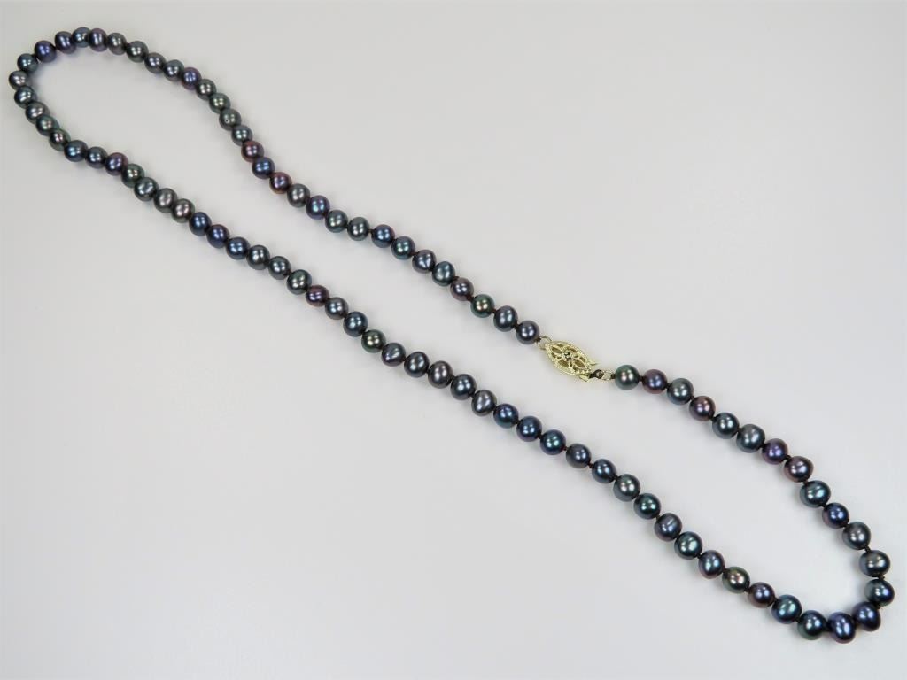 =Necklace featuring Pearls measuring approx. 5.00 MM in diameter with Peacock overtones with a high luster, necklace measures 18 inches in length with 14 karat yellow gold filigree latch.