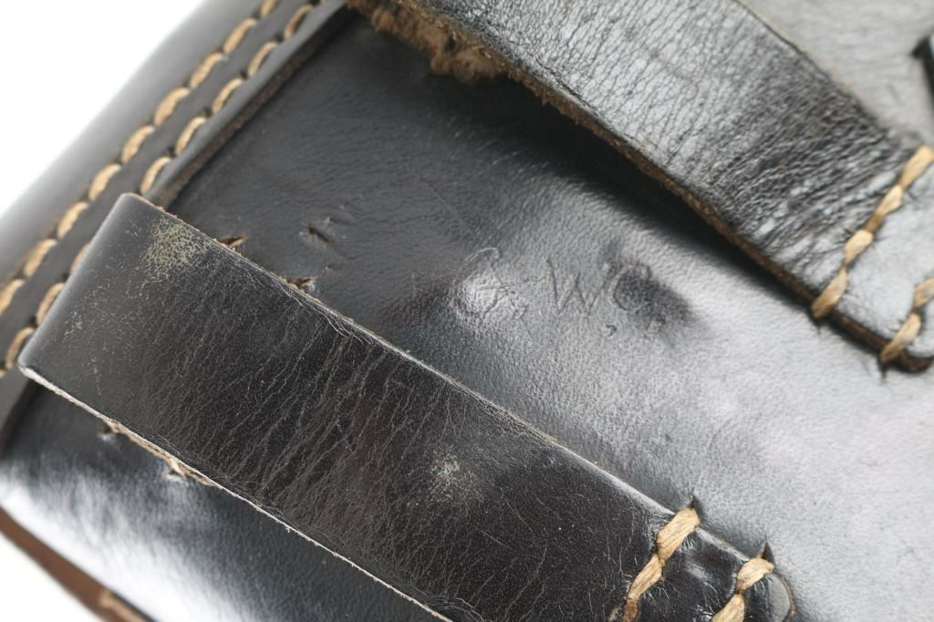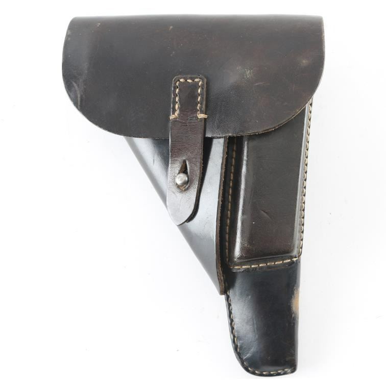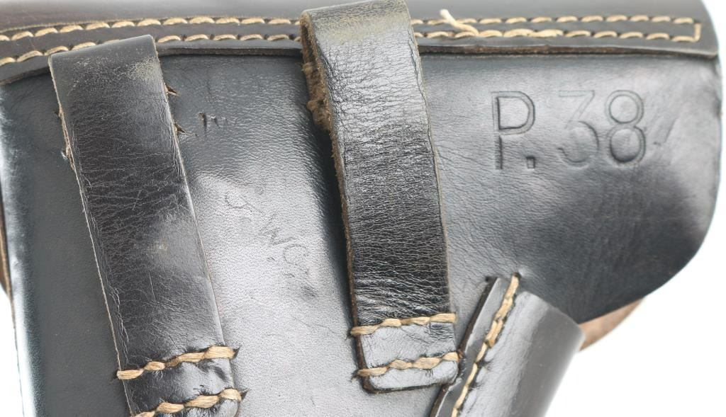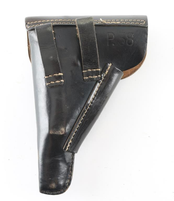 Third Reich era German Military/Police holster for the P-38 Pistol. Soft shell. Black leather construction. Large "P.38" stamped on back, along makers code bla Waffenamt Eagle/WaW159. Intact, very good condition. Third Reich era German Military/Police holster for the P-38 Pistol. Soft shell. Black leather construction. Large "P.38" stamped on back, along makers code jw last letter unreadable , No waffenamt. Intact, very good condition. Someone has lightly scratched "G.W.C. on the back.