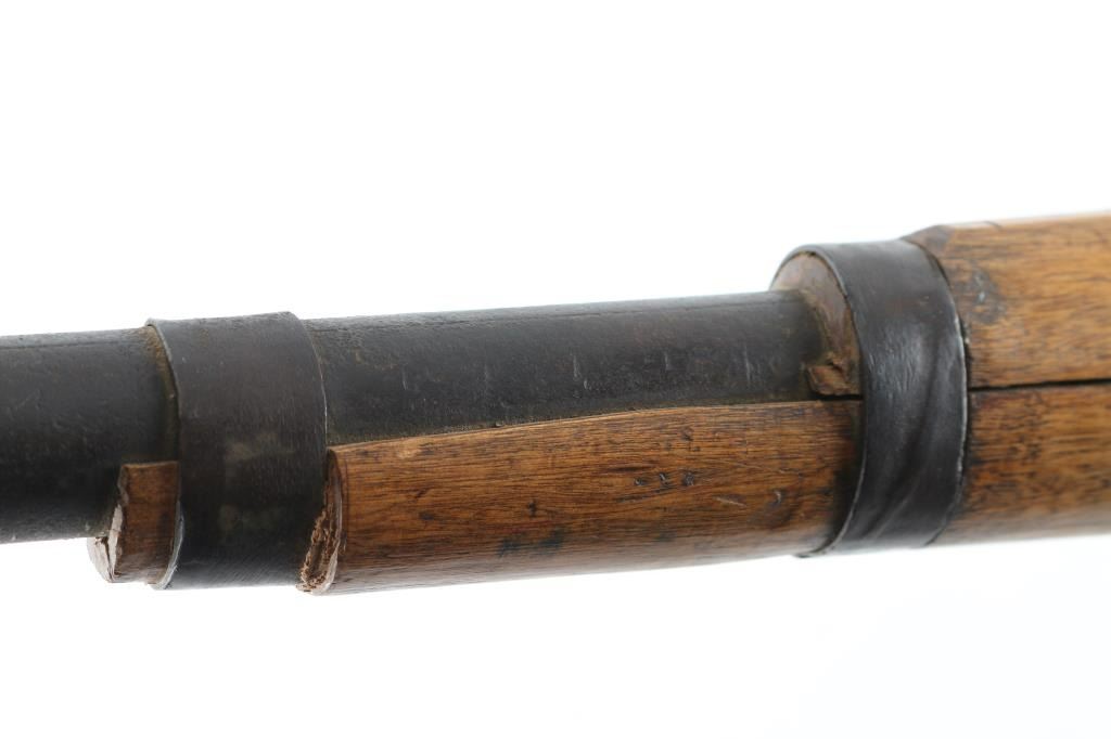 Crude, handmade, slam fire shotgun in 12 Ga manufactured in the Philippine islands. Unmarked. 28" round barrel, of which 7.5' is in the receiver. 43" overall. Guide rod to guide the barrel. Buttplate appears to be ebony, and is damaged. Bore is pitted/rusty. A real conversation piece. NRA condition-Fair/Handmade. C&R Firearm.