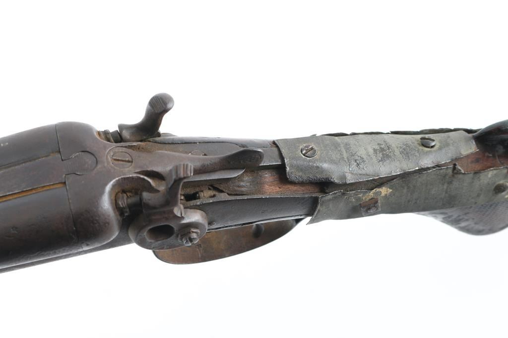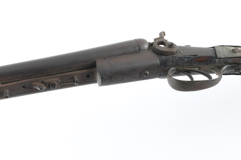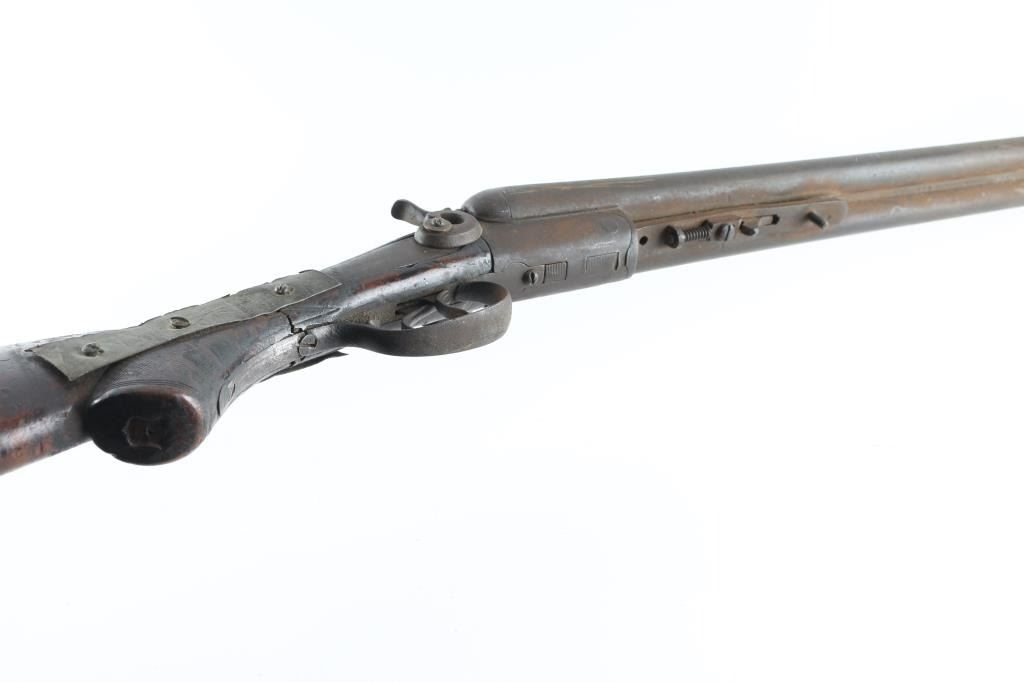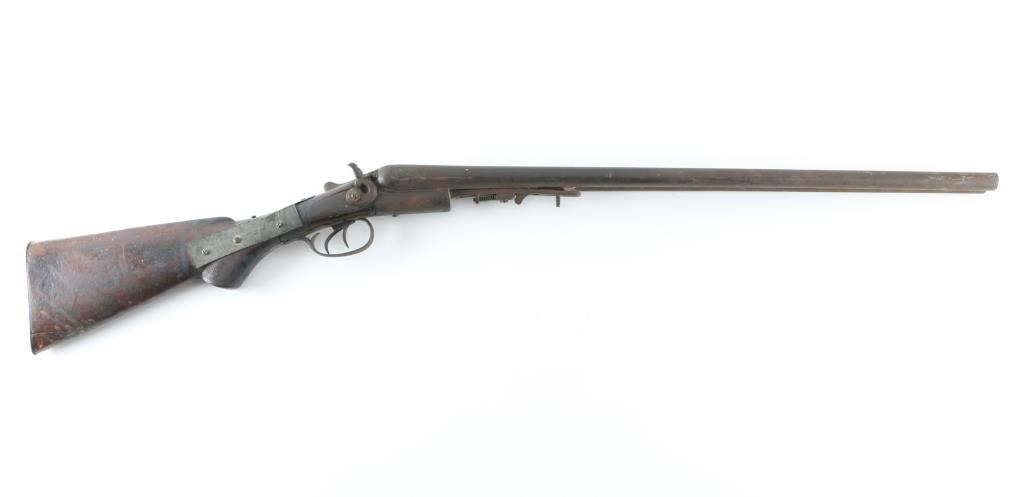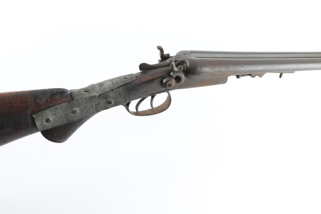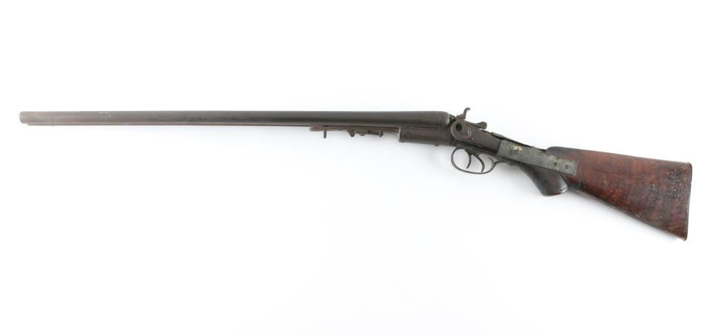 Relic Condition vintage double barrel side by side shotgun. Features 25" barrels, back locks with exposed hammers, double triggers, missing forend, hanger present, curved grip walnut stock, thin metal buttplate, large repair plates at wrist. Action does open, and hammers & triggers operate. Bore is fair condition, with debris and other accumulated dirt inside. Metal surfaces are brown with thin old rust. Wood is distressed, cracked thru, dented, held together with rough edged metal plates and hardware store fasteners, loose feel at break. ***WALLHANGER ONLY*** Condition is NRA Poor *** C&R Firearm ***