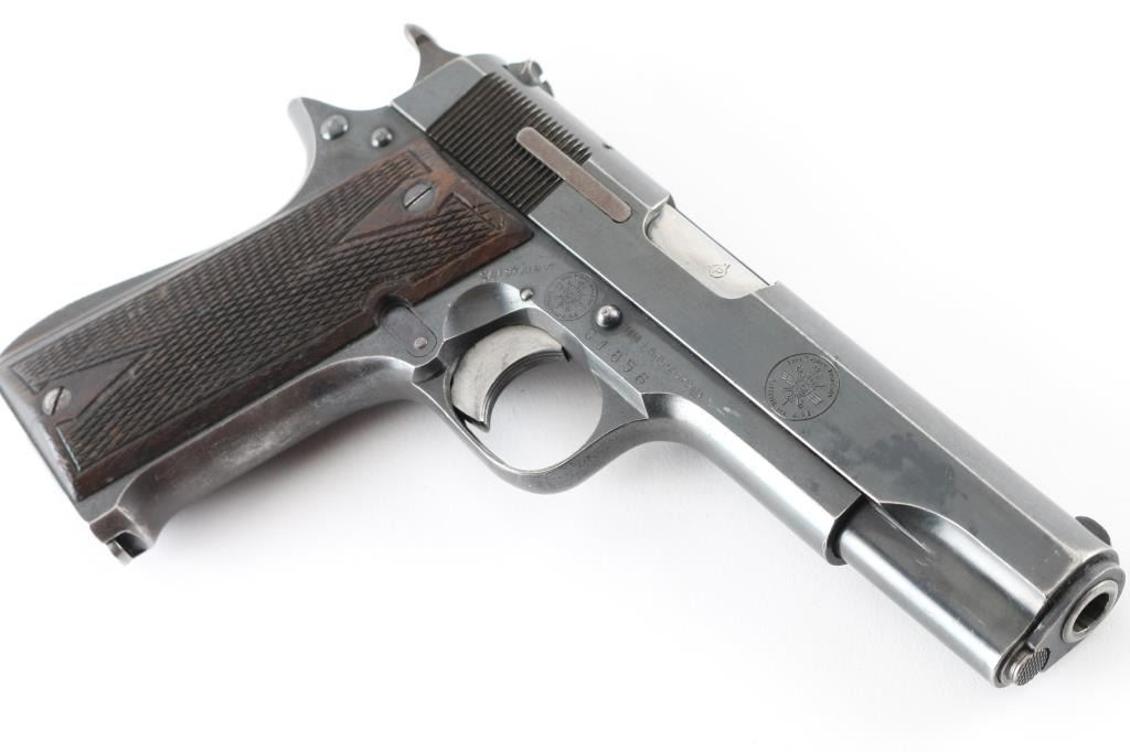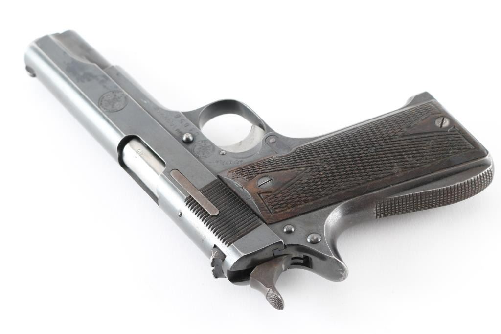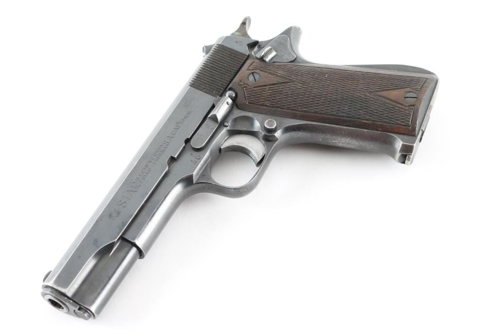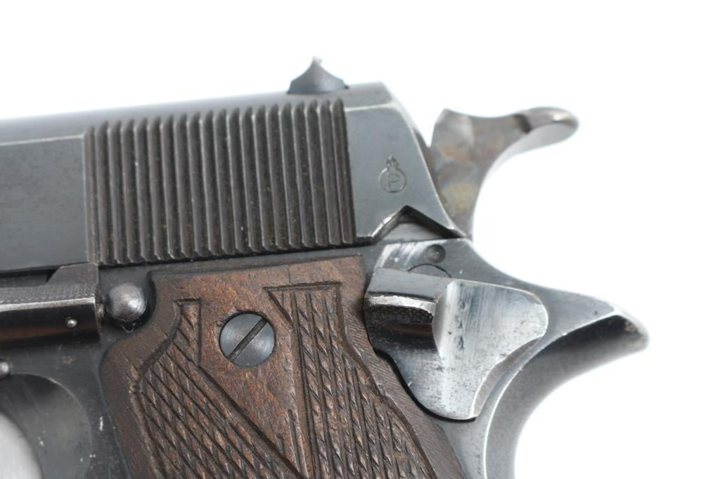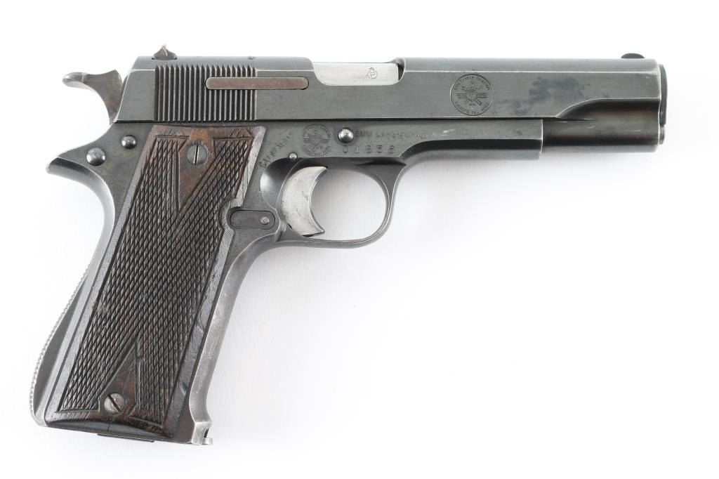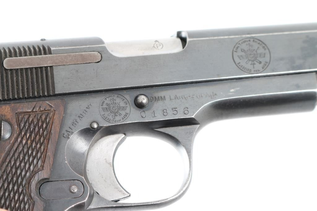 Spanish Air Force marked single action semi-automatic pistol chambered in 9mm Largo, manufactured by Star Bonifacio Echeverria, Eibar S.A. circa 1946. 8+1 capacity. Made in the style of the M1911. Imported by Century Arms. Vt. , marked on the right frame. Shipped to the Spanish Air Force between 1945-1950. 7.25" overall, with a 4" barrel. Fixed sights. Frame mounted thumb safety. Spanish Air Force crest stamped on right frame, and slide. serrated trigger. Blued metal finish, with checkered, diamond wood grips. Comes with one 8-rd magazine. Slide action is smooth/tight. Bore appears good/bright, but has some very light areas of pitting. Wood grips are very good.. Blued finish is 90%, with edge wear, scratches, and rubs. Nothing serious NRA Condition-Good/Very good. C&R firearm.