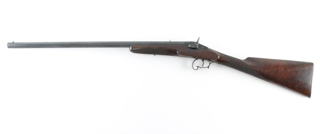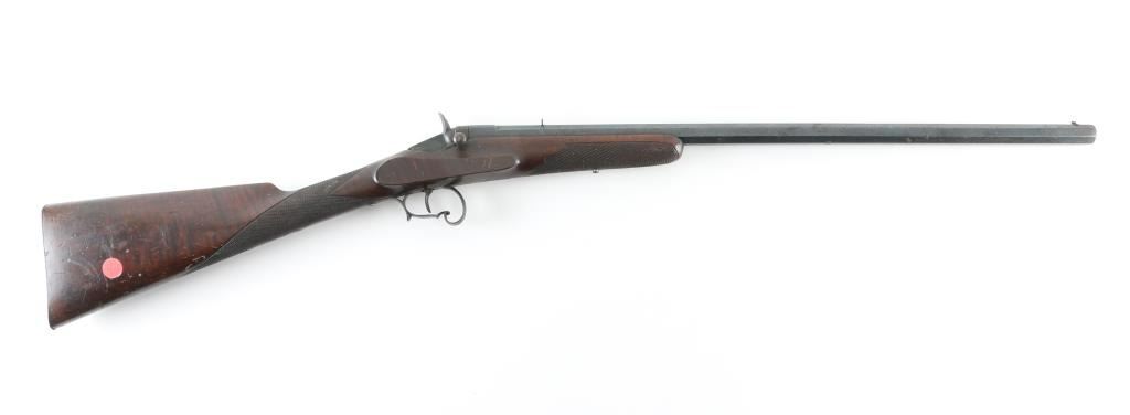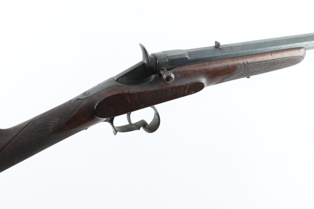 Vintage French breech loading rifle features blued finish, 23.5" octagon barrel, blade front & notch rear sights in dovetails, checkered walnut stock, straight wrist, smooth metal buttplate, exposed hammer on centerline, side hinged breech block. Hammer will not stay on half cock, pushes off full cock fairly easily. Bore is poor to fair condition, somewhat shiny, shows frosting and light pitting throughout, hard to see the thin traces of eroded rifling. Retains 60% dark blued finish, appears a recent reblue, with scattered patina throughout. Wood is good condition, chipped & scraped, no visible cracks, checkering slightly smoothed with good defined diamonds. Replacement screw on lower tang. Condition is NRA Fair++ (Hammer Fall Issue) *** Antique Firearm ***