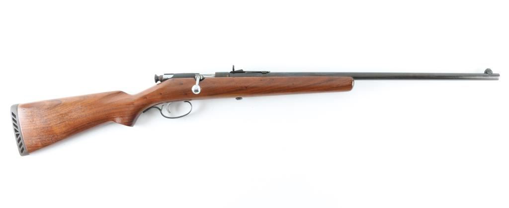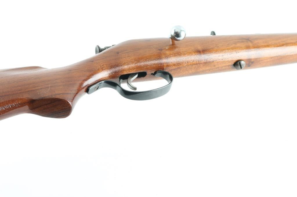 Vintage bolt action sporting rifle, in a rare chambering. Not model marked, consistent with features of a model 53 or 83. Features blued 24" barrel, gold beaded blade front sight, Marble's buckhorn rear sight, chromed bolt & trigger, walnut stock, ventilated rubber recoil pad. No manual safety present. Left side of receiver has drilled & tapped hole, and the adjacent wood is inlet, most likely intended for installation of a receiver sight. Bore is very good condition. Retains 60% finish, with fading and browning to blue, edge losses, impact marks on sides of rear sight dovetail. Stock is varnished, good condition. Recoil pad is a bit hard. Condition is NRA Good++ *** C&R Firearm ***